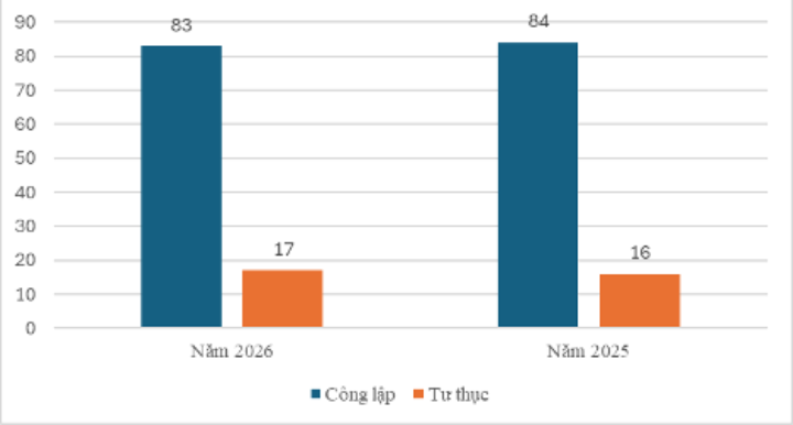 Xếp hạng theo loại hình trường, các trường công lập vẫn chiếm đa số trong Top 100 của VNUR-2026, với 83 trường, tương ứng 83%, giảm nhẹ so với 84% của năm 2025.