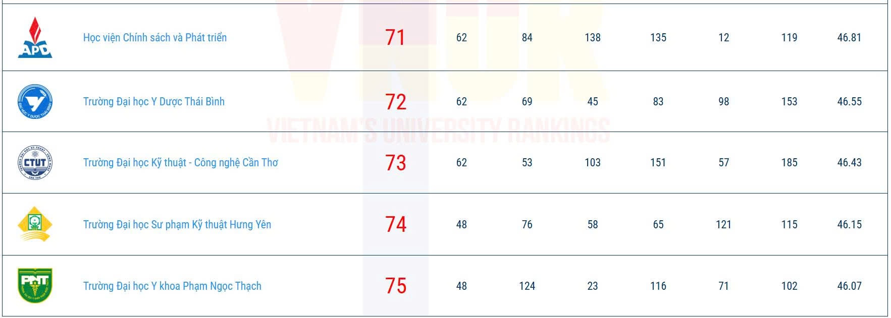 So với VNUR-2025, một số nhóm ngành có xu hướng giảm nhẹ về số lượng trường trong Top 100, bao gồm Kỹ thuật, Công nghệ (giảm từ 11 xuống 10), Sức khỏe (từ 12 xuống 11), Kinh tế, Tài chính (từ 9 xuống 7), Hành chính (từ 5 xuống 4) và Nông – Lâm (từ 3 xuống 2).