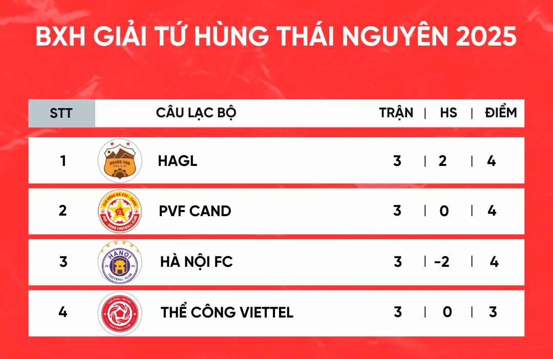 Kết quả này khiến HAGL, Hà Nội FC và PVF-CAND cùng có 4 điểm, nhưng HAGL vô địch nhờ hơn chỉ số phụ.