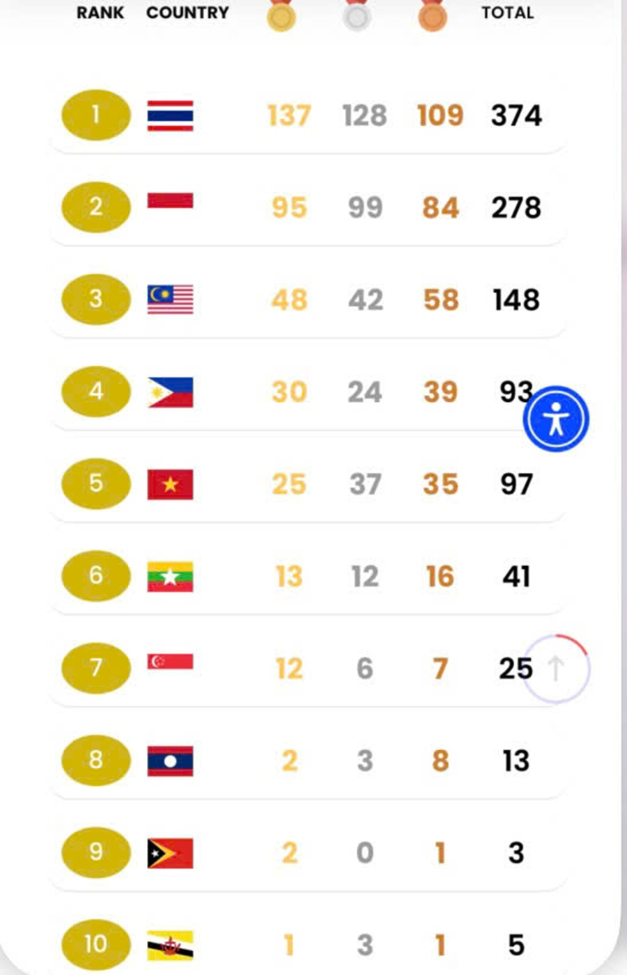 Dẫn đầu là chủ nhà Thái Lan với 137 HCV, 128 HCB và 109 HCĐ.