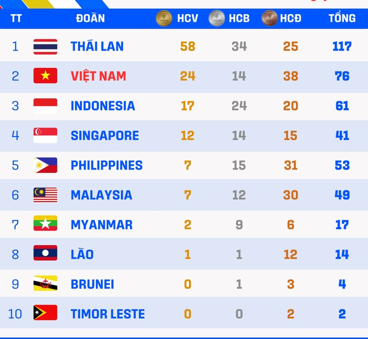 Bảng xếp hạng huy chương SEA Games 2025 hôm nay (cập nhật)