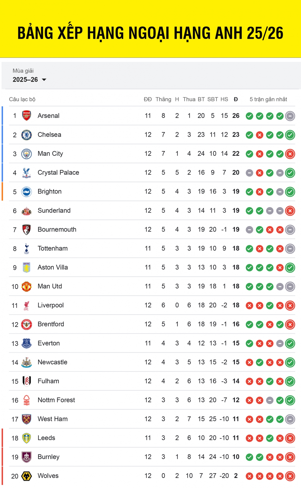 Bảng xếp hạng Ngoại hạng Anh 2025/2026 mới nhất tính đến sáng 23/11.