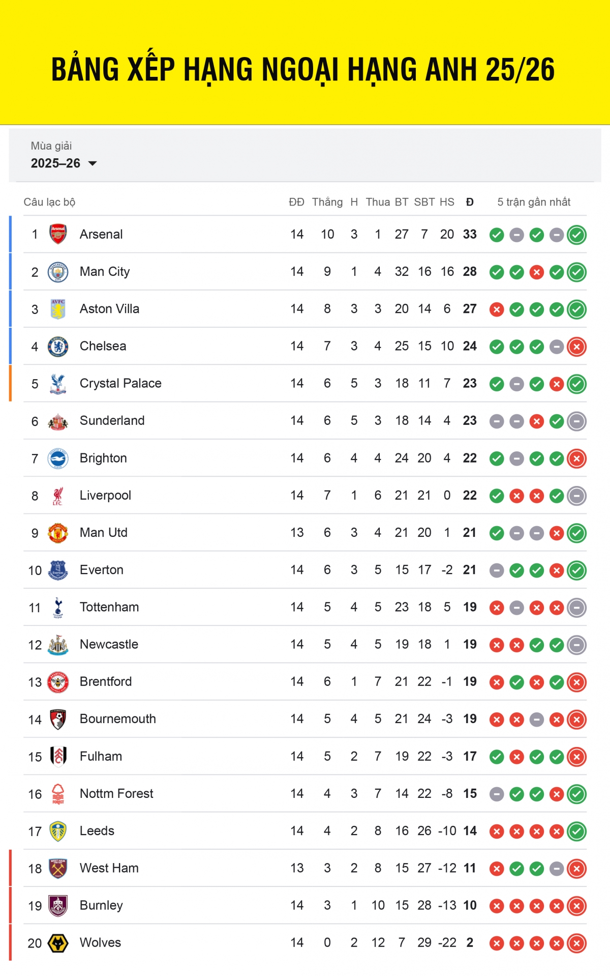 Rạng sáng 4/12, vòng 14 Ngoại hạng Anh 2025/2026 diễn ra sôi động khi Arsenal, Chelsea và Liverpool đồng loạt ra sân. Arsenal tiếp đón Brentford tại Emirates và nhanh chóng áp đảo. Merino bật cao đánh đầu ghi bàn ở phút 11, trước khi Saka dứt điểm chính xác ở phút 90+1 để ấn định chiến thắng 2-0. Với 33 điểm, Arsenal tiếp tục giữ vững ngôi đầu bảng xếp hạng Ngoại hạng Anh 2025/2026, đồng thời tạo khoảng cách 5 điểm với Man City.