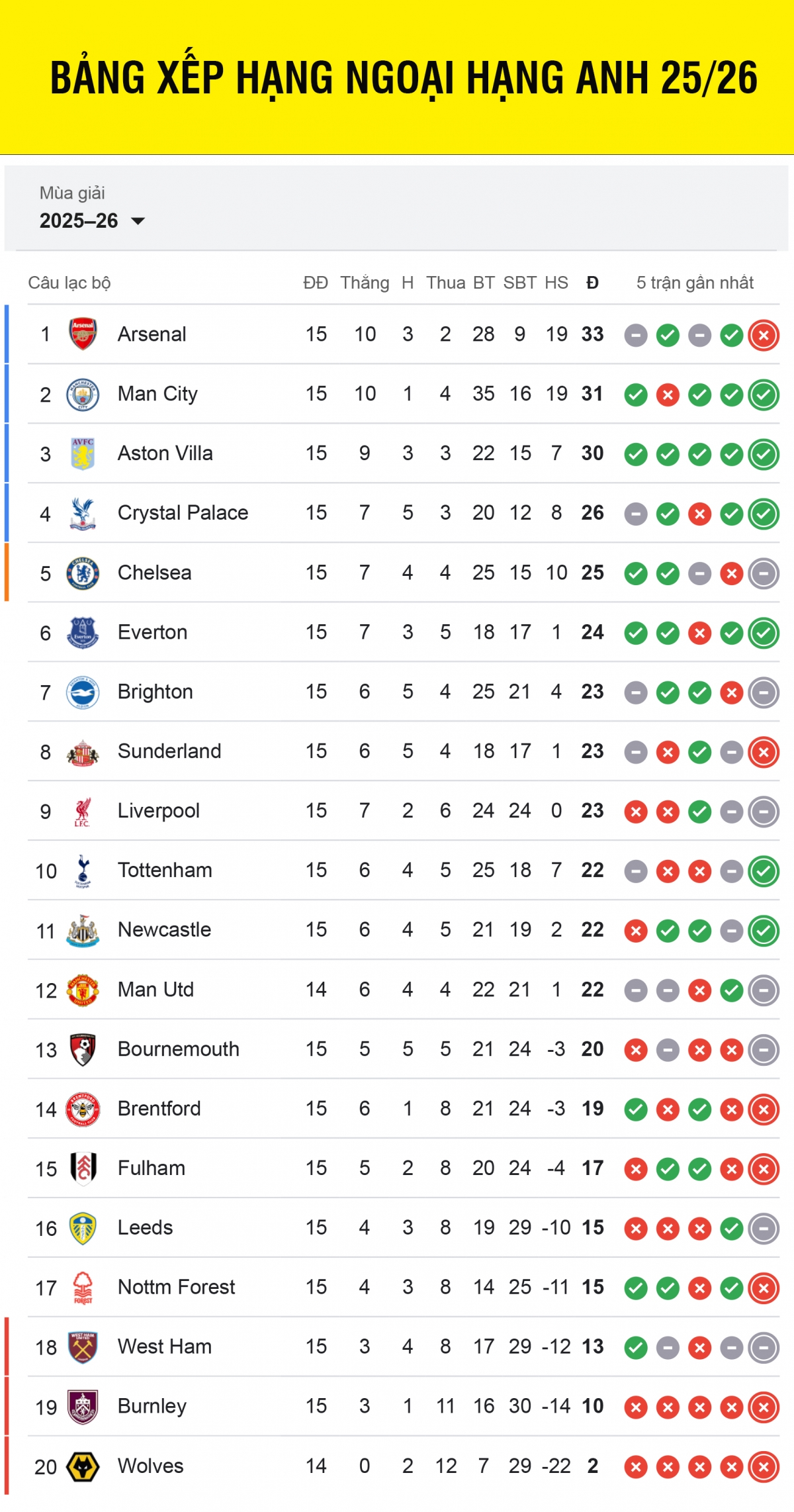 Cập nhật bảng xếp hạng Ngoại hạng Anh 2025/2026 mới nhất tính đến sáng 8/12.