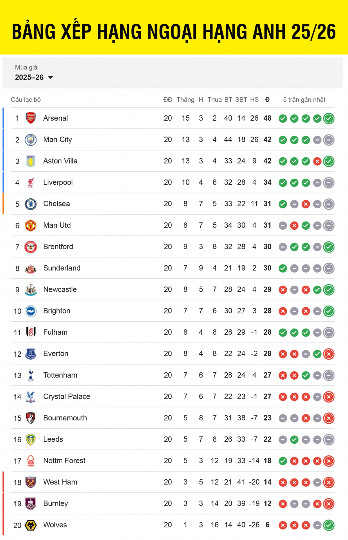 Cập nhật bảng xếp hạng Ngoại hạng Anh 2025/2026 mới nhất sau vòng 20.