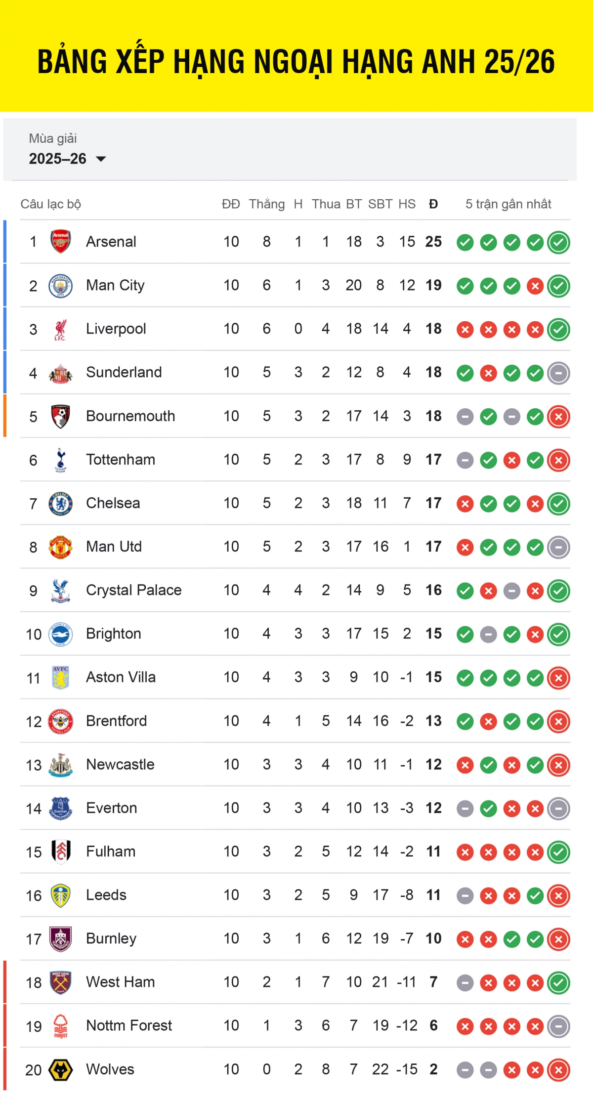 Bảng xếp hạng Ngoại hạng Anh 2025/2026 sau vòng 10.