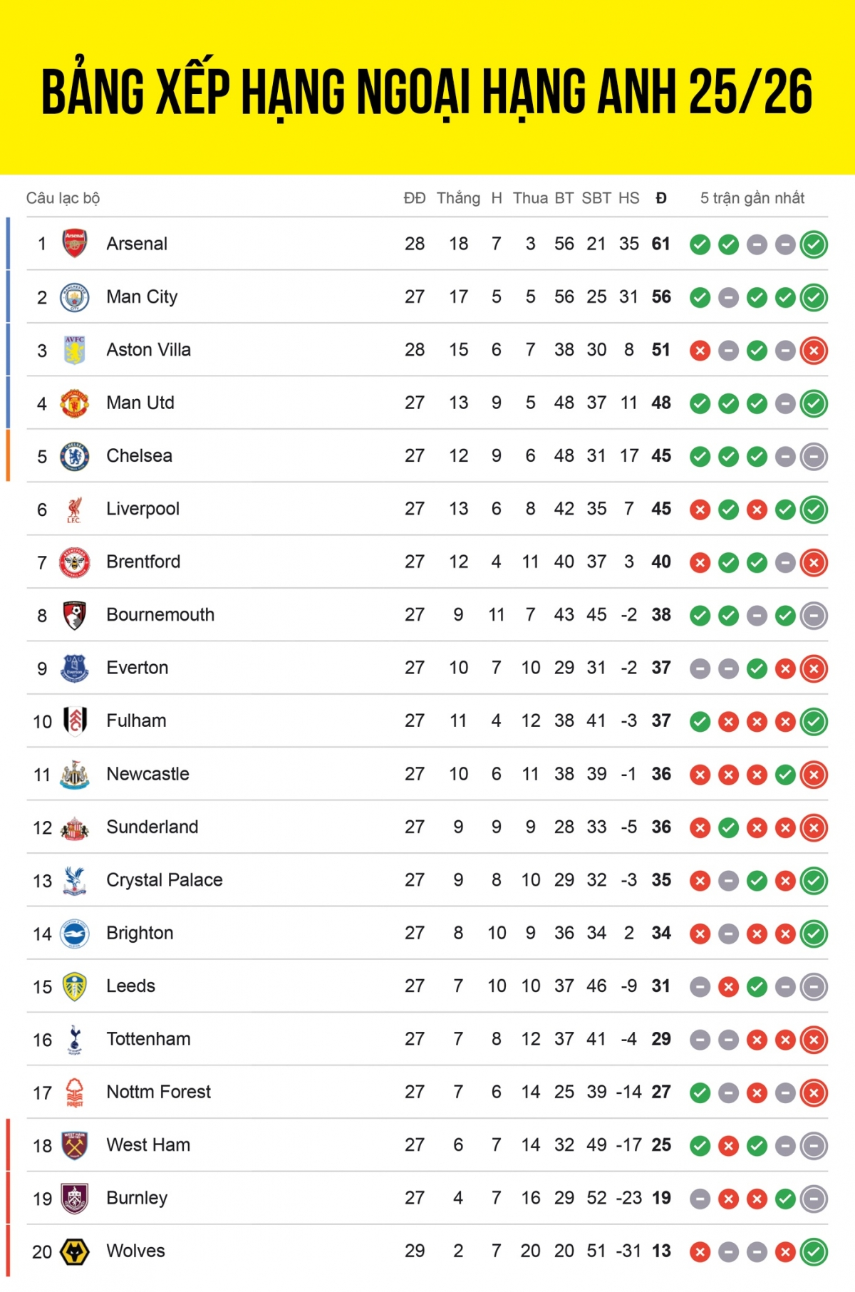 Cập nhật bảng xếp hạng Ngoại hạng Anh 2025/2026 mới nhất tính đến sáng 28/2.