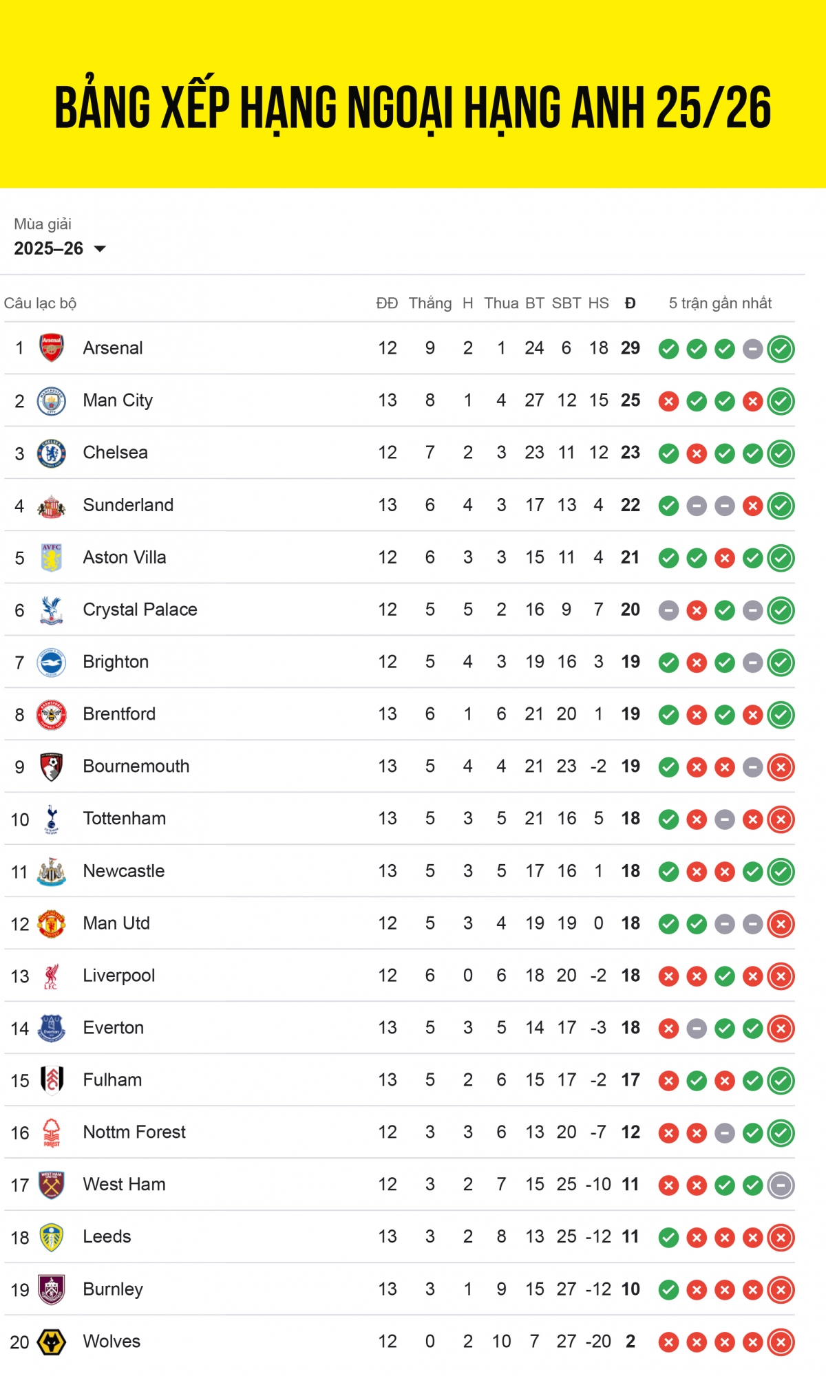 Bảng xếp hạng Ngoại hạng Anh 2025/2026 tính đến sáng 30/11.