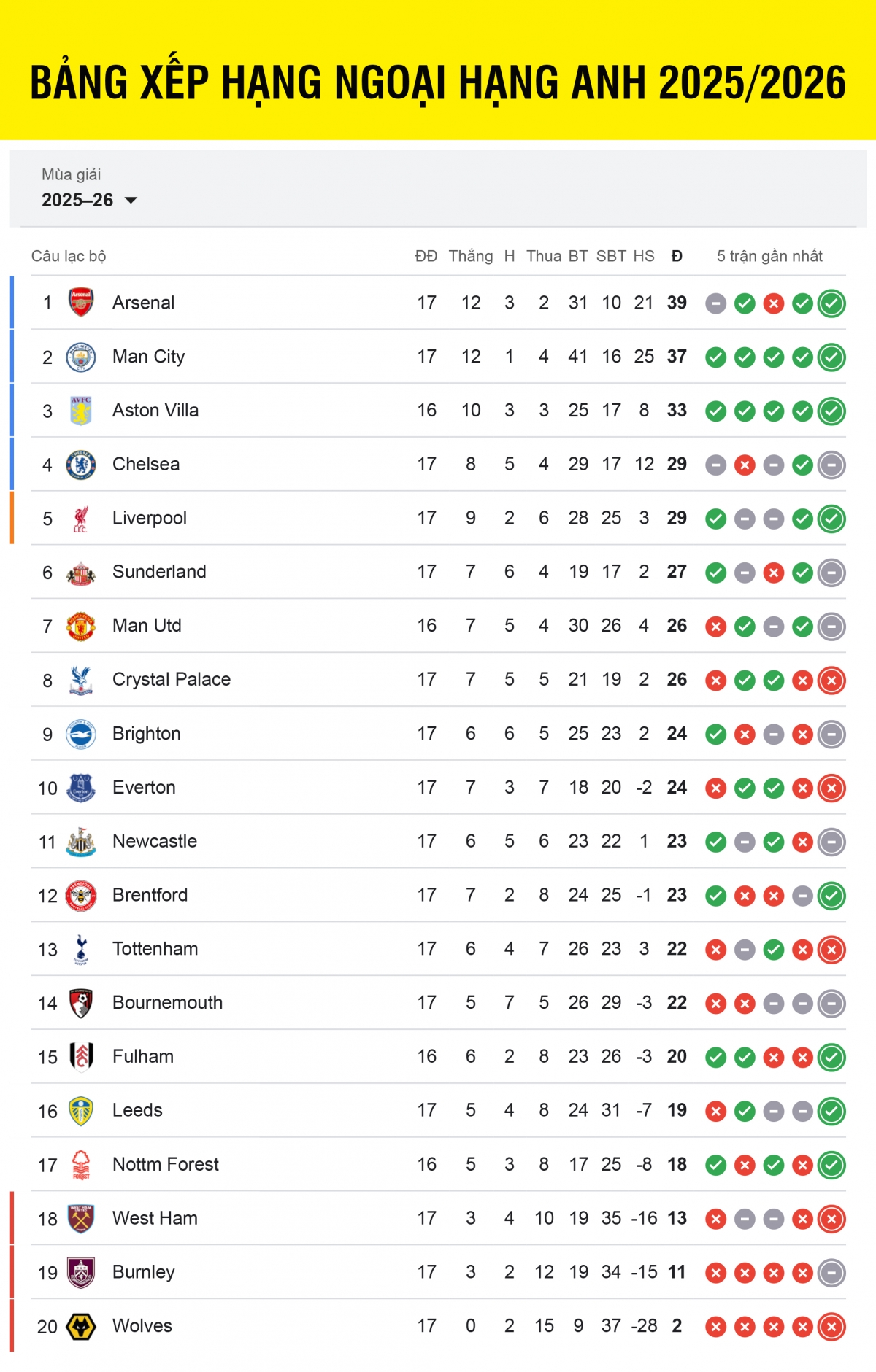 Kết quả vòng 17 Ngoại hạng Anh ngày 21/12 tiếp tục tạo ra những thay đổi đáng chú ý trên bảng xếp hạng khi Liverpool, Arsenal và Man City đều giành trọn 3 điểm. Trong đó, Arsenal duy trì phong độ ổn định với chiến thắng tối thiểu 1-0 trước Everton, qua đó củng cố vững chắc ngôi đầu bảng với 39 điểm, tạo khoảng cách 2 điểm so với Man City.
