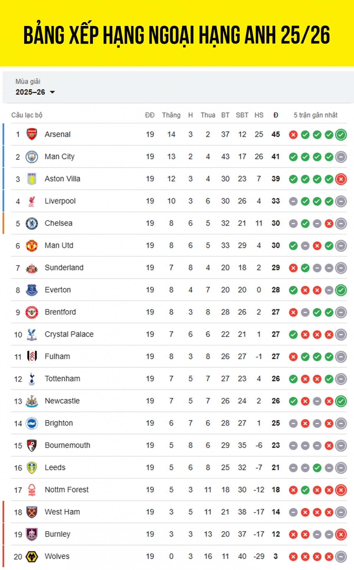 Cập nhật bảng xếp hạng Ngoại hạng Anh 2025/2026 mới nhất tính đến sau vòng 19.