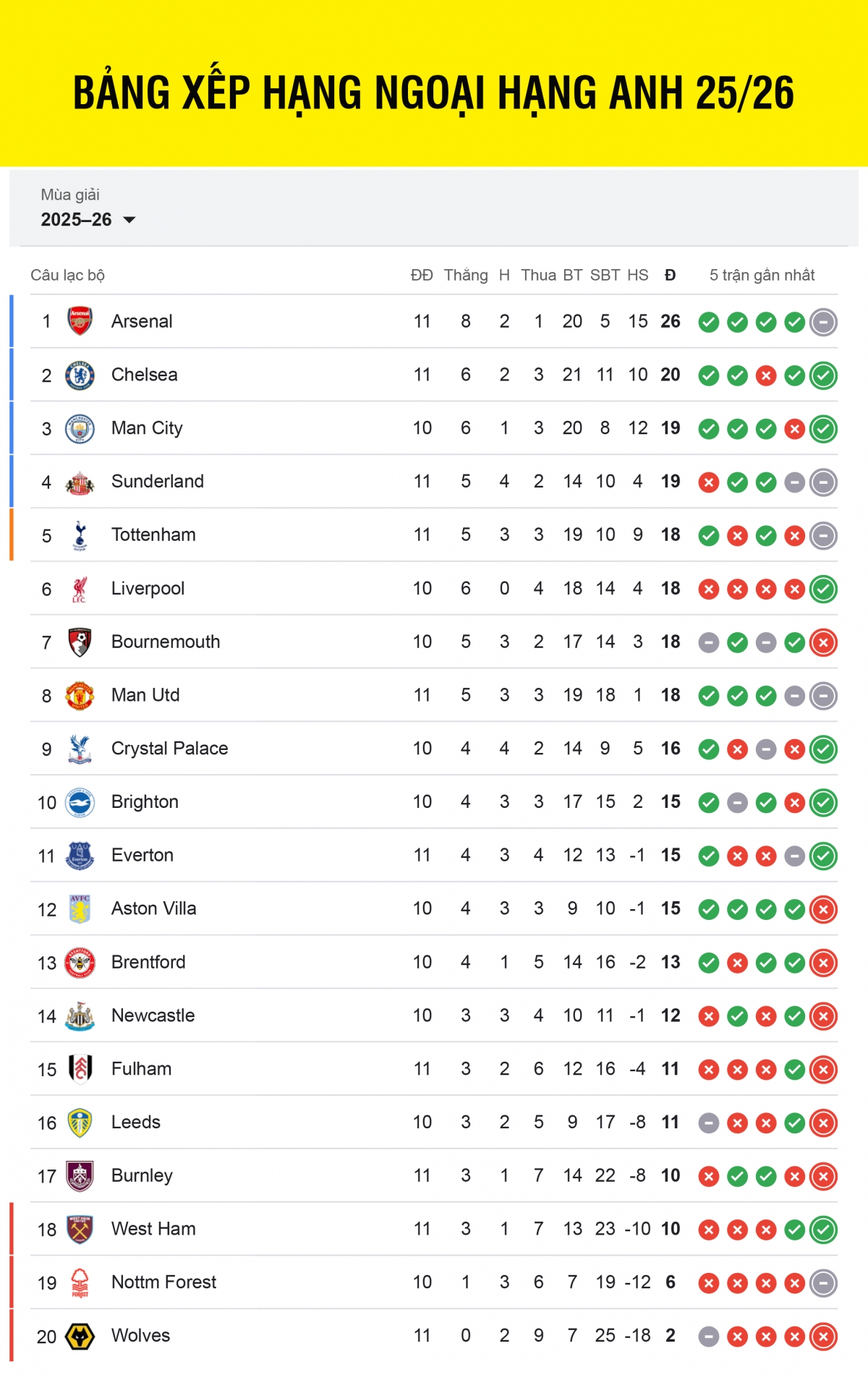 Bảng xếp hạng Ngoại hạng Anh 2025/2026 tính đến sáng 9/11.