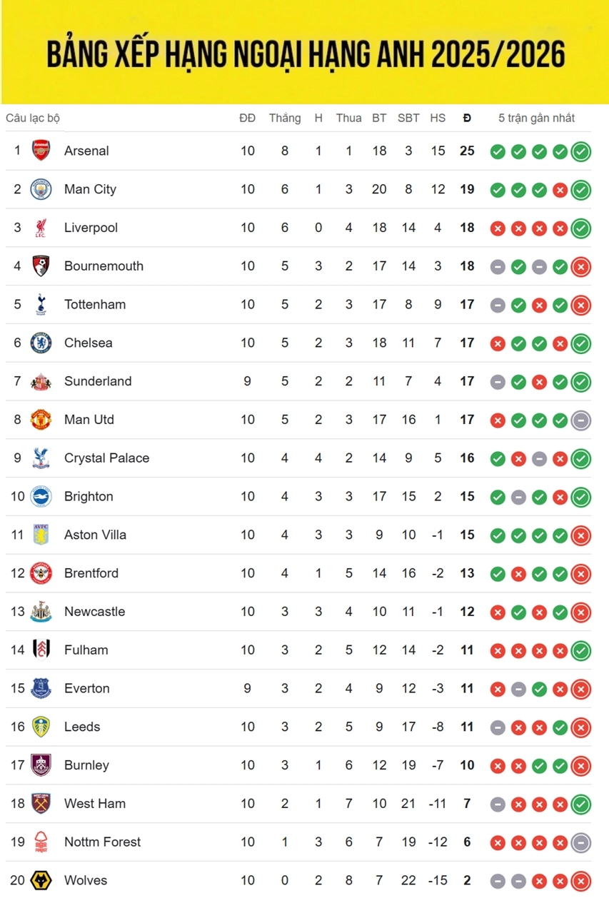 Bảng xếp hạng Ngoại hạng Anh mới nhất cập nhật sáng 3/11, Arsenal tiếp tục dẫn đầu và đã tạo nên khoảng cách 6 điểm so với đội xếp sau là Man City. Pháo thủ đã sở hữu 25 điểm sau 10 trận trong khi Man City nhì bảng nhưng mới chỉ có 19 điểm.