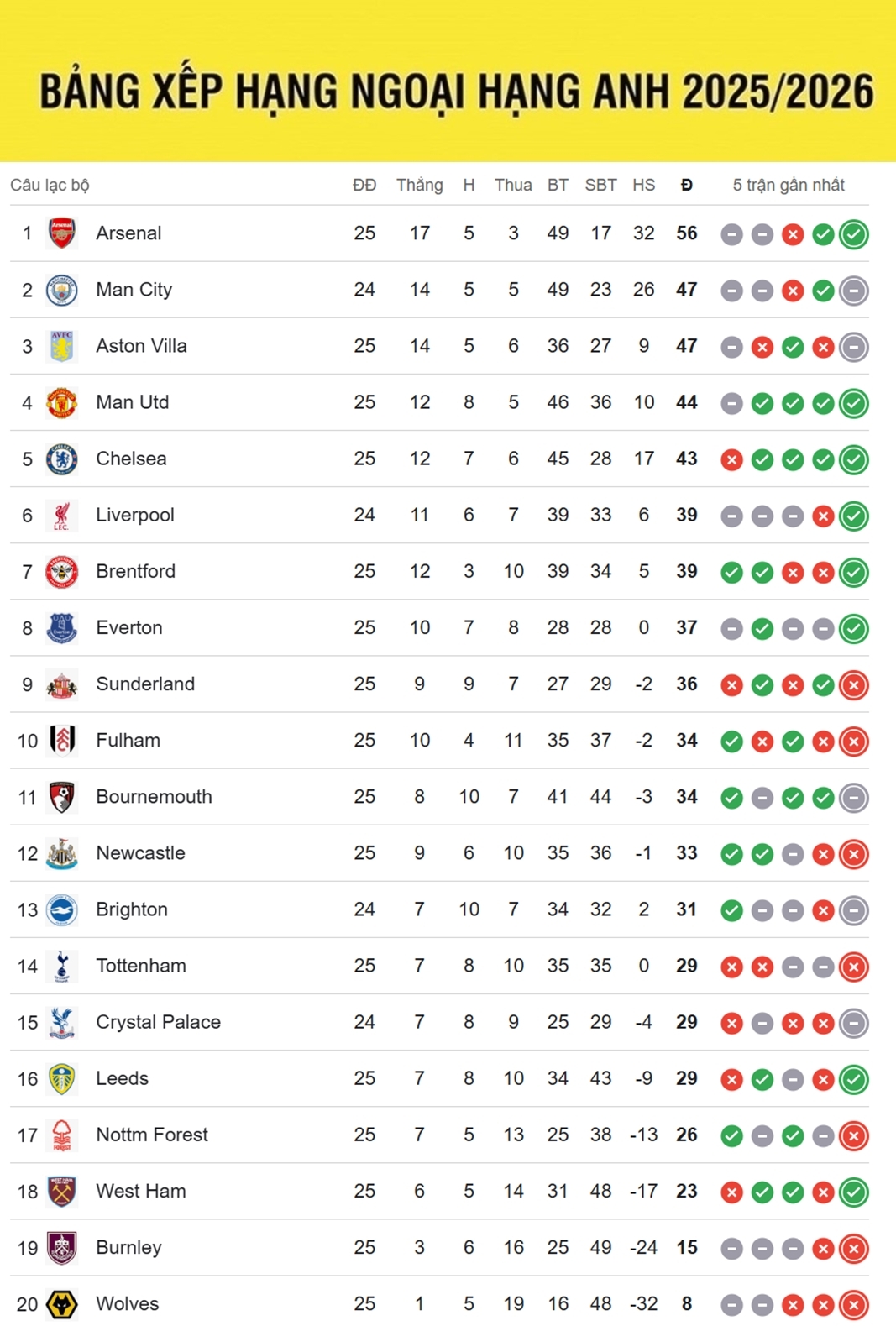 Bảng xếp hạng Ngoại hạng Anh mới nhất cập nhật sáng 8/2, Arsenal vững vàng ở ngôi đầu khi tạo ra khoảng cách 9 điểm với Man City và Aston Villa. Trong khi đó, Chelsea và MU đua tranh quyết liệt cho vị trí trong tốp bốn.