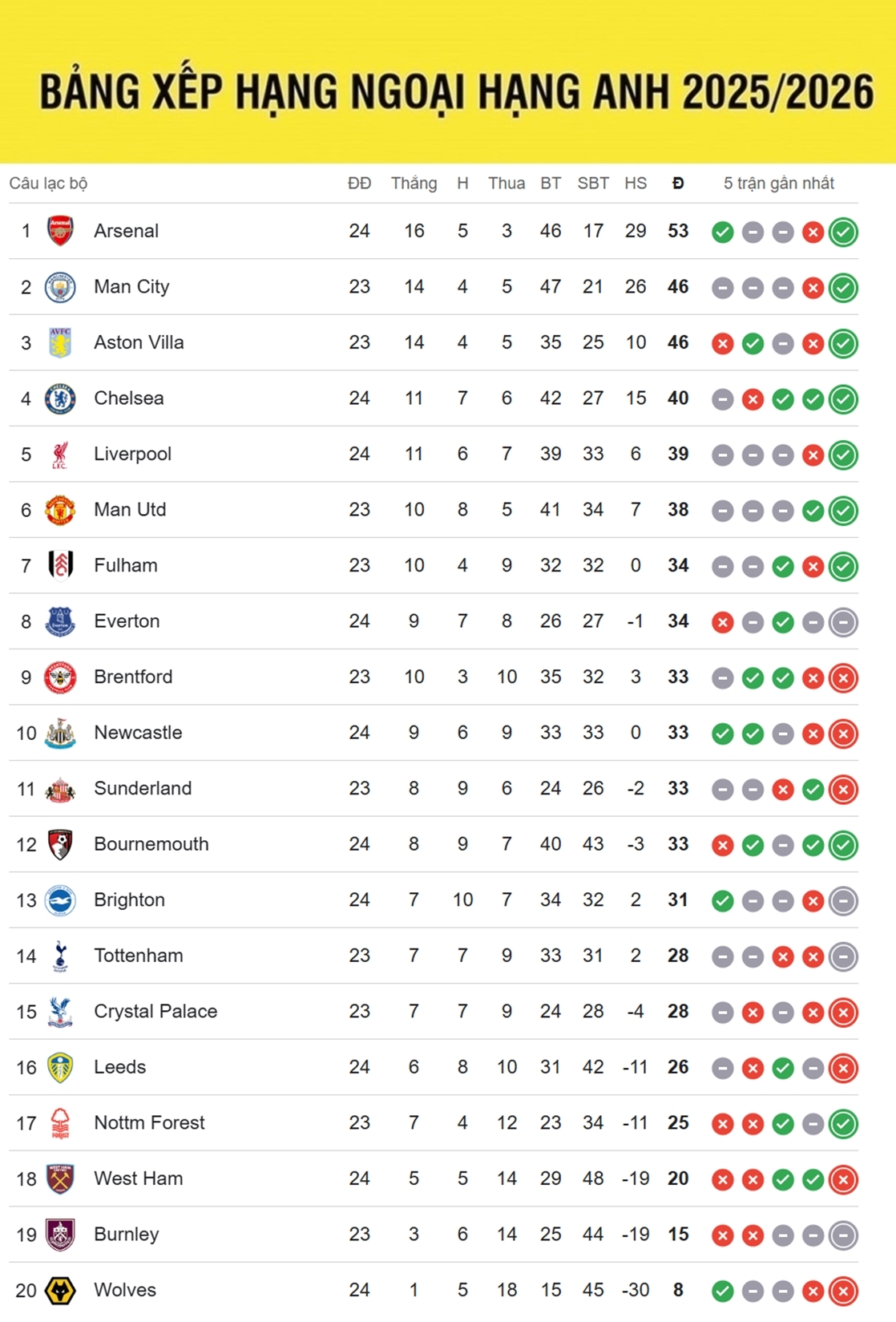 Bảng xếp hạng Ngoại hạng Anh mới nhất, cập nhật sáng 1/2, Arsenal dẫn đầu với khoảng cách bảy điểm so với đội xếp sau. Trong khi đó, Chelsea và Liverpool cùng thắng để "thổi lửa" vào cuộc đua tốp bốn.