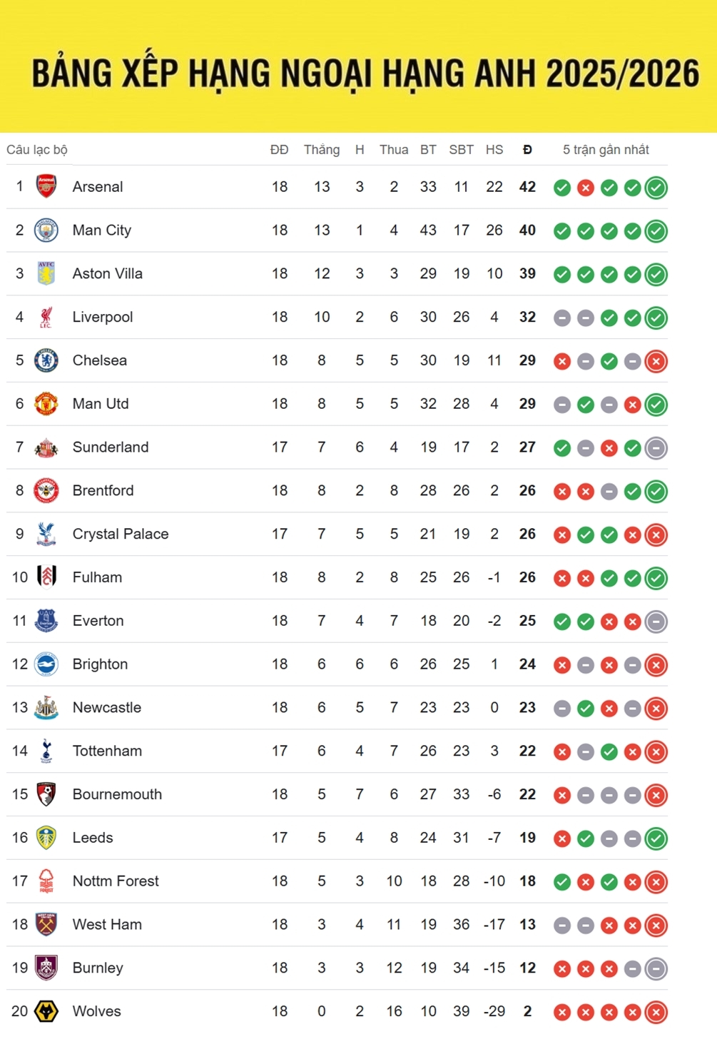 Bảng xếp hạng Ngoại hạng Anh mới nhất cập nhật sáng 28/12/2025, Arsenal đua vô địch cùng Man City khi khoảng cách giữa đôi bên tiếp tục chỉ là 2 điểm sau vòng 18. Aston Villa với chiến thắng trước Chelsea cũng áp sát ngay phía sau.