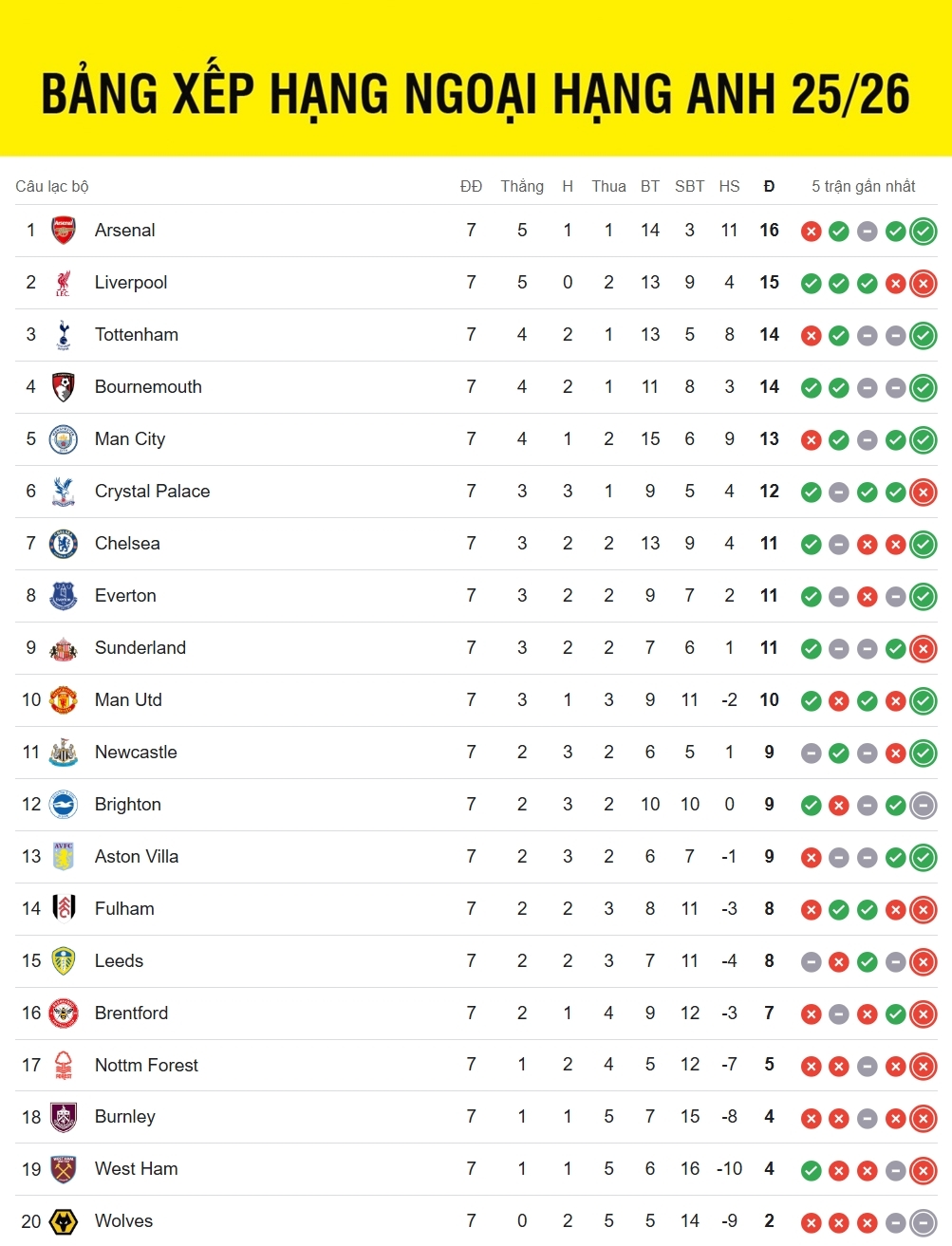Bảng xếp hạng Ngoại hạng Anh mới nhất cập nhật sáng 6/10: Hiện tượng Crystal Palace bị "giải mã" khi thua 1-2 trước Everton. Căng thẳng tốp đầu khi các đội bóng có khoảng cách không đáng kể. Đội dẫn đầu Arsenal chỉ hơn đội thứ 10 MU khoảng cách 6 điểm.