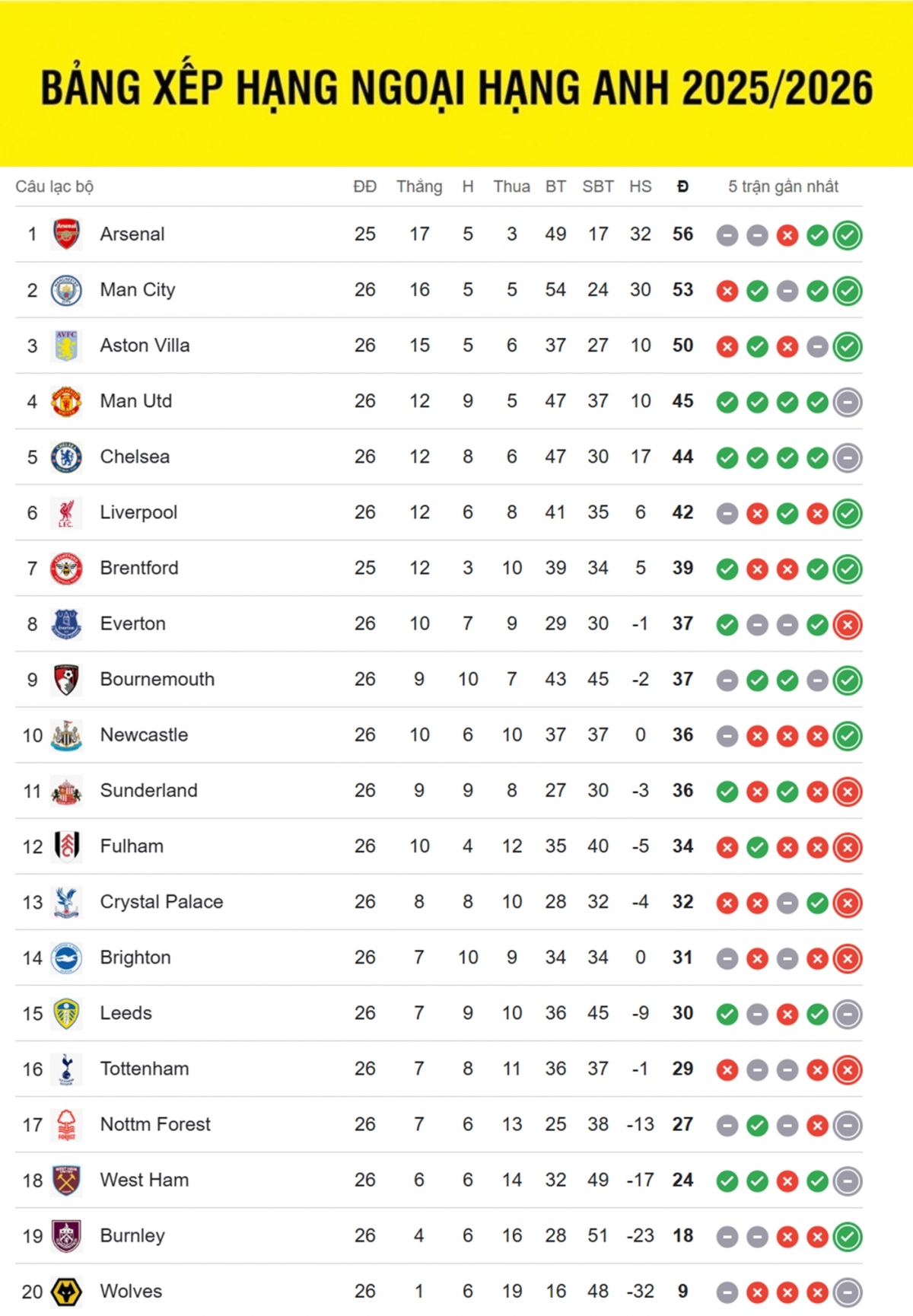 Bảng xếp hạng Ngoại hạng Anh mới nhất cập nhật sáng 12/2: Man City chỉ còn kém Arsenal 3 điểm sau trận đấu diễn ra rạng sáng 12/2. Man City đánh bại Fulham 3-0 với các bàn thắng của Haaland, Semenyo và O'Reilly để sở hữu 53 điểm, trong khi Arsenal đang có 56 điểm.