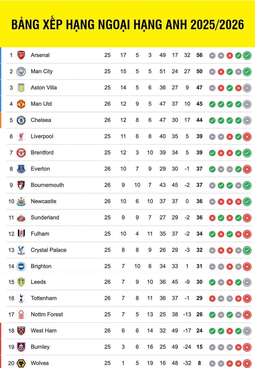 Bảng xếp hạng ngoại hạng Anh mới nhất.