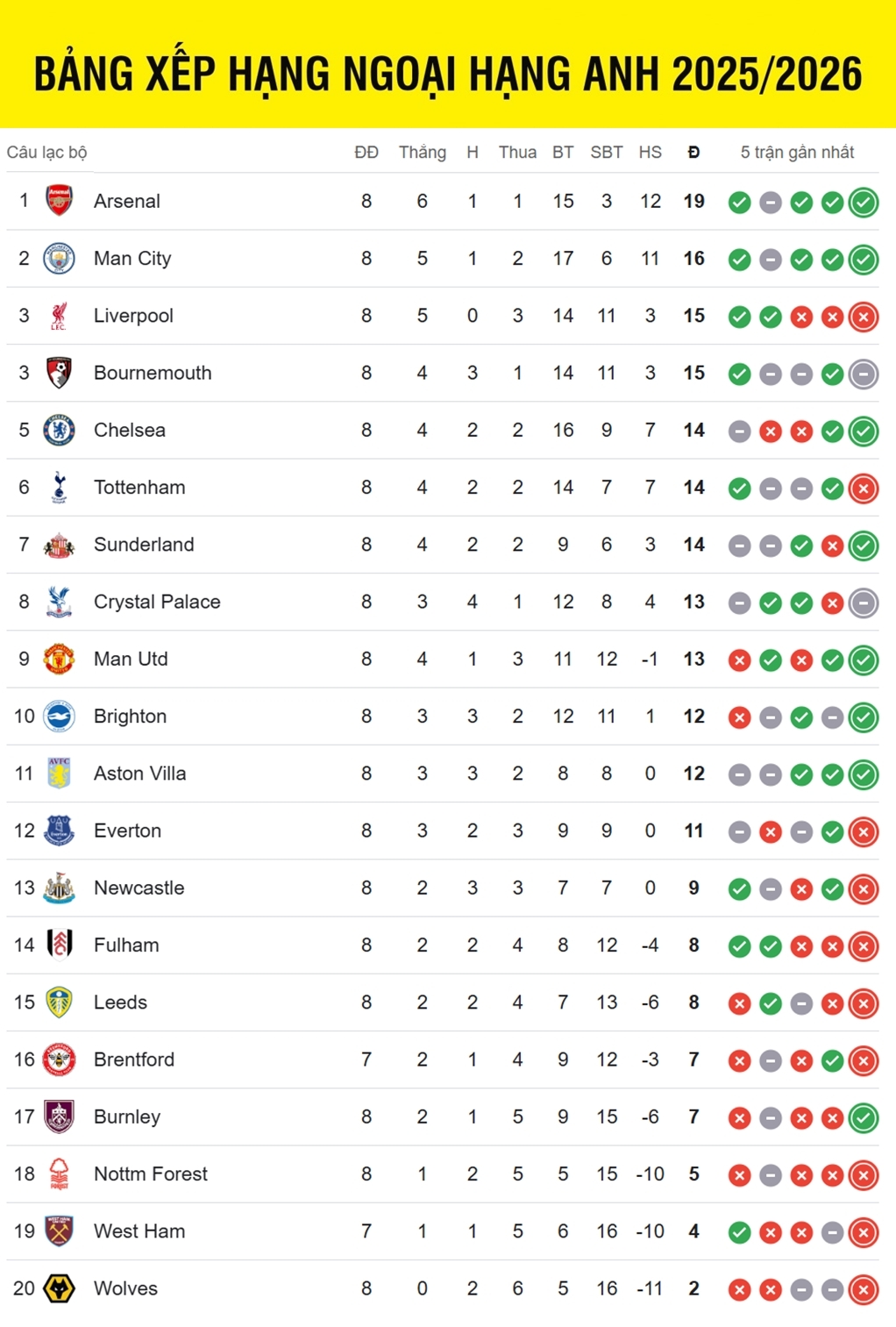 Bảng xếp hạng Ngoại hạng Anh mới nhất cập nhật sáng 20/10, MU thăng tiến lên vị trí thứ 9, Liverpool tụt hạng sâu, mất vị trí nhì bảng vào tay Man City sau trận đấu ở Anfield.
