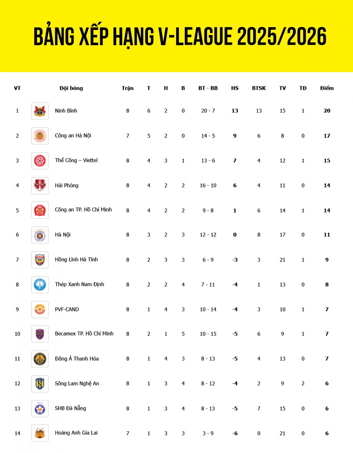 Bảng xếp hạng V-League 2025/2026 mới nhất: CAHN thăng hoa, Nam Định khủng hoảng