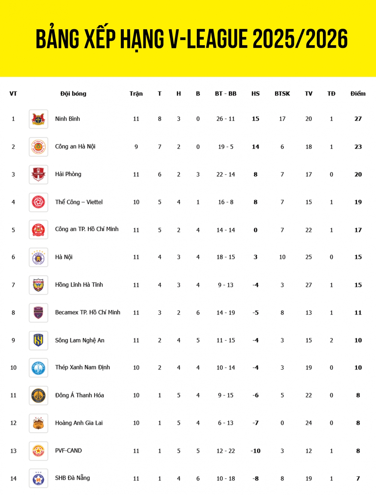 Cập nhật bảng xếp hạng V-League 2025/2026 mới nhất tính đến sáng 11/11