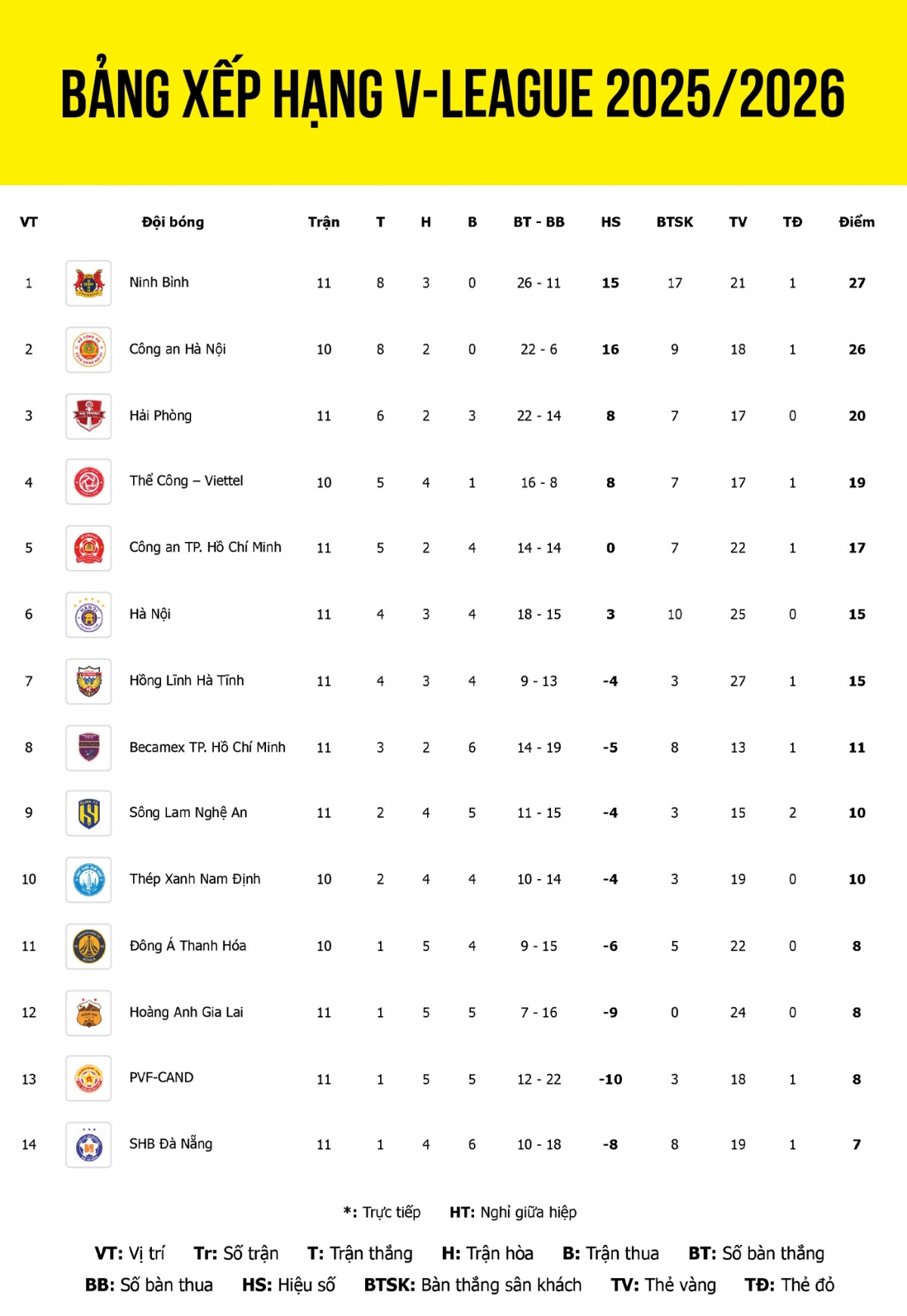 Cập nhật bảng xếp hạng V-League 2025/2026 mới nhất tính đến sáng 19/12.