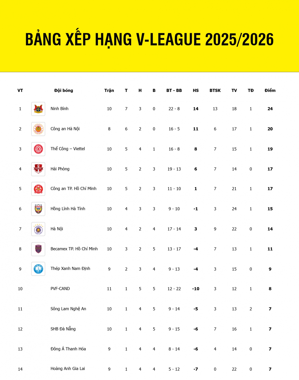 Bảng xếp hạng V-League 2025/2026 tính đến sáng 9/11.