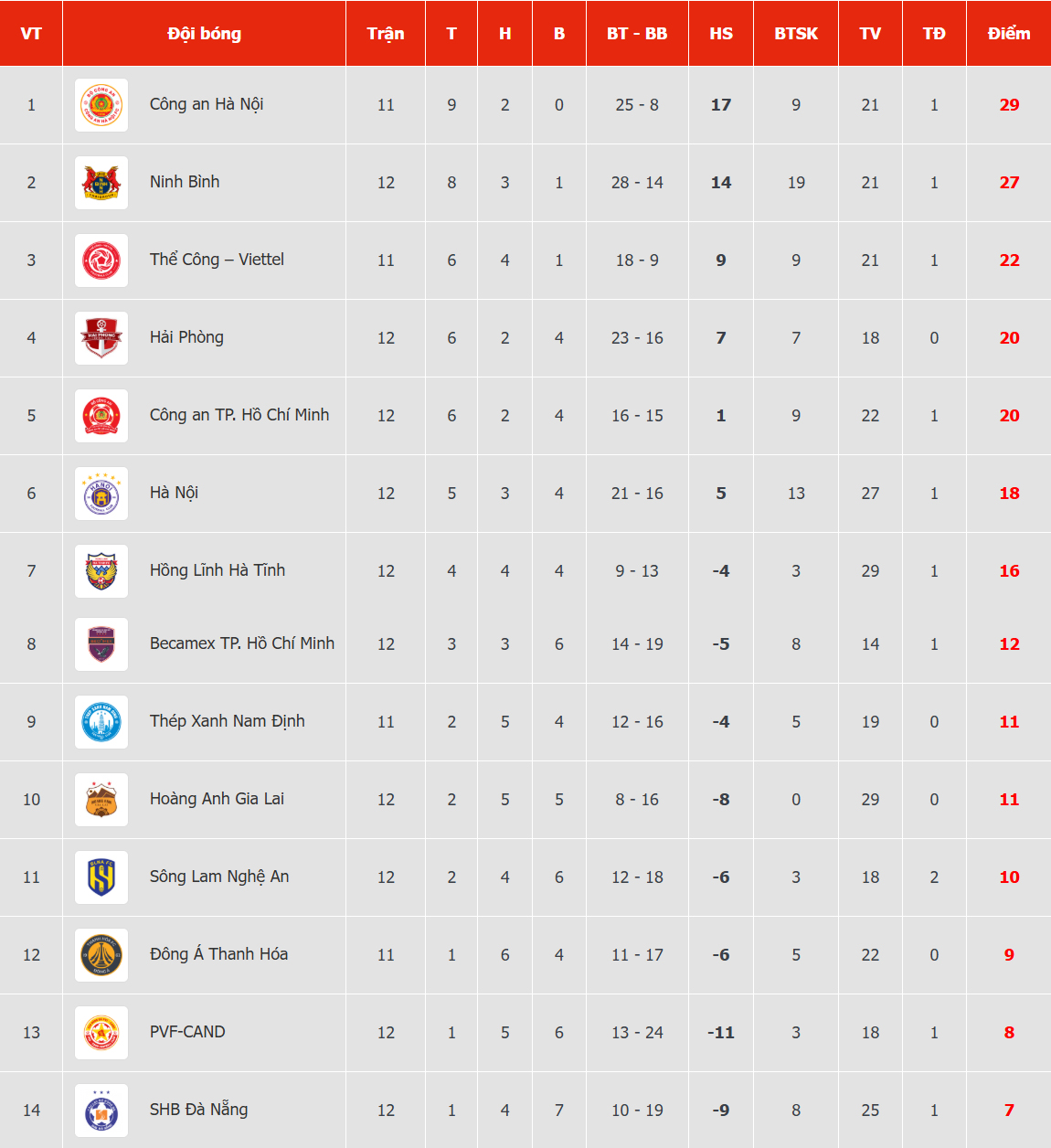 Thắng trận 3-2, Công an Hà Nội FC chiếm ngôi đầu bảng của Ninh Bình FC khi sở hữu 29 điểm và mới thi đấu 11 trận. Trong khi đó, Ninh Bình FC đã đá 12 trận sở hữu 27 điểm, xếp thứ nhì.