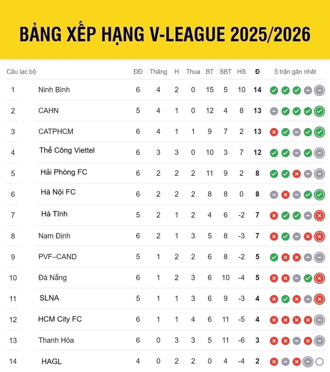 Bảng xếp hạng V-League mới nhất, cập nhật sáng 3/10: Tốp đầu có sự cạnh tranh quyết liệt giữa 4 đội Ninh Bình, CLB CAHN, CLB CA TP.HCM và Thể Công Viettel. Trong khi đó, HAGL lại tụt xuống cuối bảng với vỏn vẹn 2 điểm.