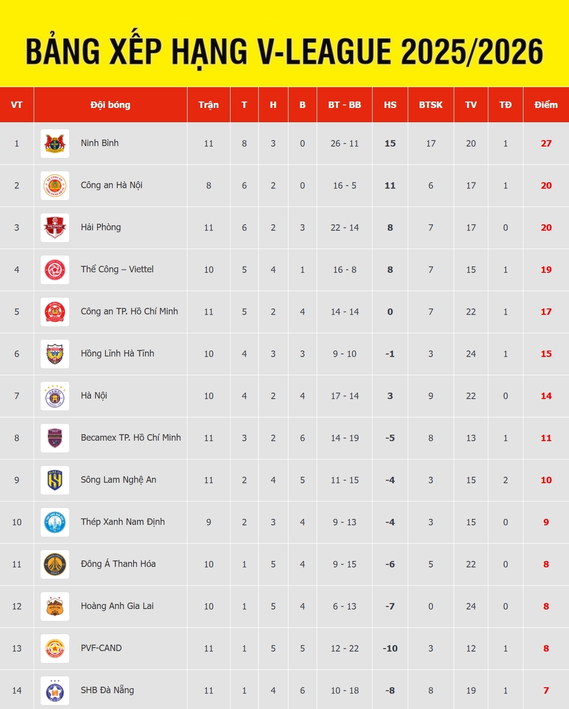 Bảng xếp hạng V-League mới nhất cập nhật sáng 10/11. Ninh Bình củng cố ngôi đầu khi tạo ra khoảng cách bảy điểm với đội xếp sau là CLB CAHN. Tuy nhiên, thầy trò HLV Albadalejo đã thi đấu nhiều hơn đối thủ đến ba trận.