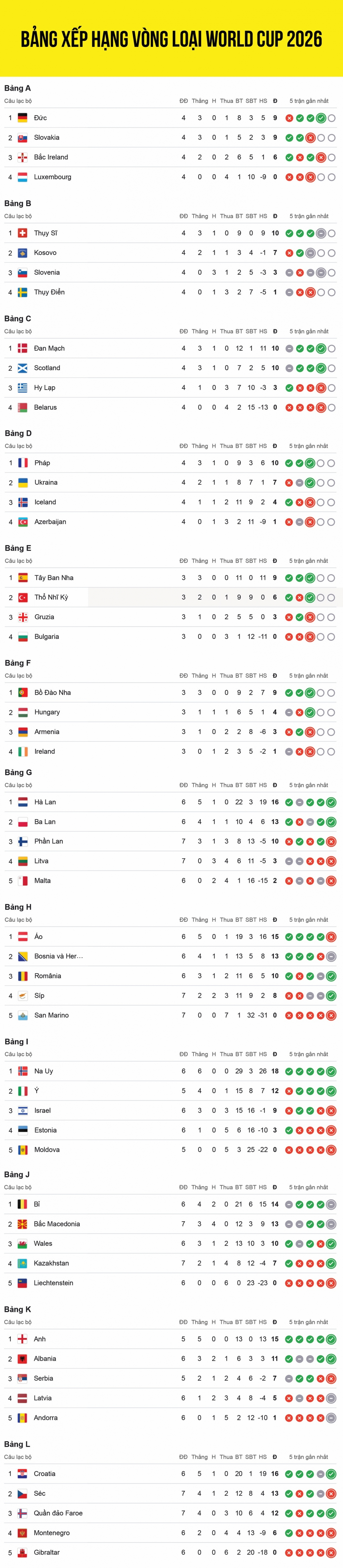 Bảng xếp hạng vòng loại World Cup 2026 khu vực châu Âu mới nhất