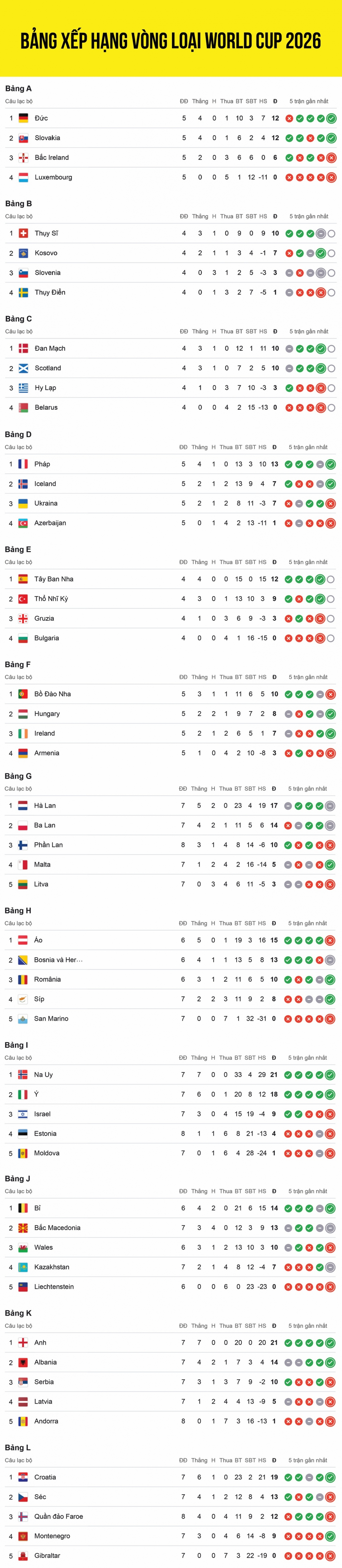 Cập nhật bảng xếp hạng vòng loại World Cup 2026 khu vực châu Âu tính đến sáng 15/11.