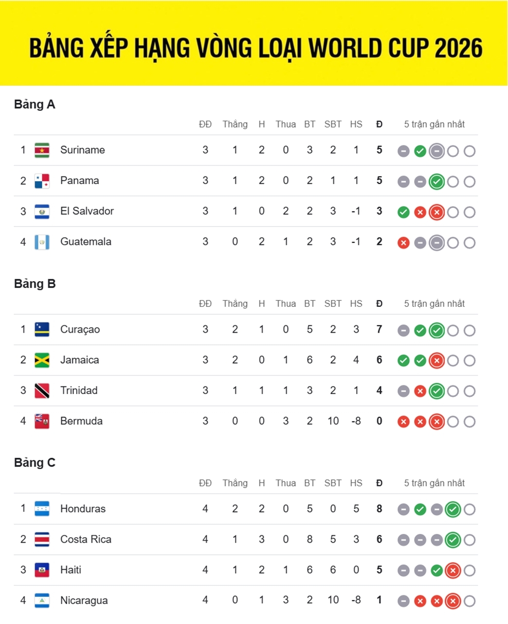Bảng xếp hạng vòng loại World Cup 2026 khu vực CONCACAF mới nhất, ngoại binh V-League là trung vệ Justin Garcia có cơ hội tranh vé dự vòng chung kết.