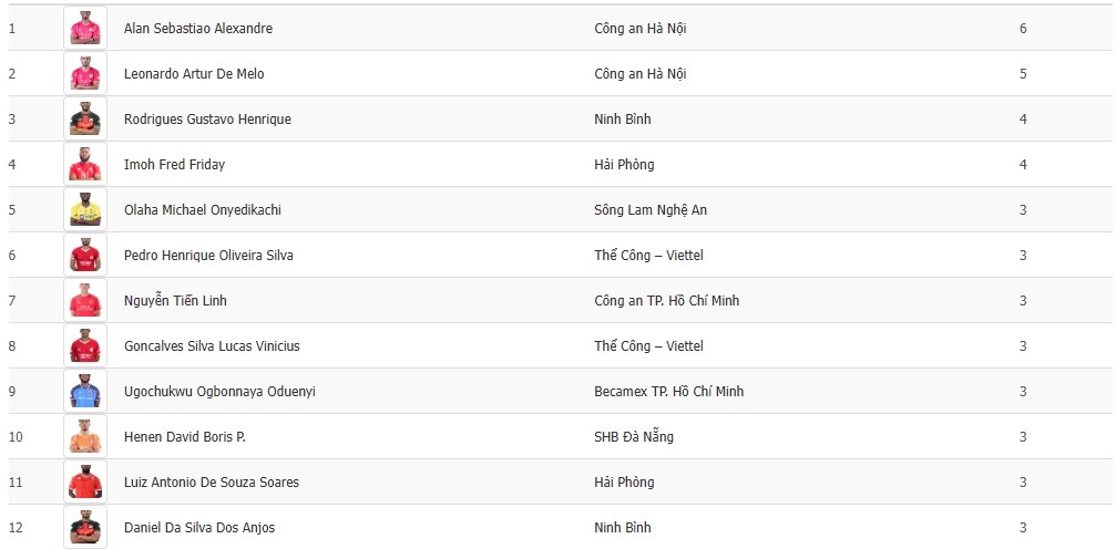 Ở các vị trí tiếp theo trên bảng xếp hạng “Vua phá lưới” V-League 2025/2025, Rodrigues Gustavo Henrique (Ninh Bình) và Imoh Fred Friday (Hải Phòng) đang bám sát bộ đôi của CLB CAHN khi cùng có 4 bàn thắng.