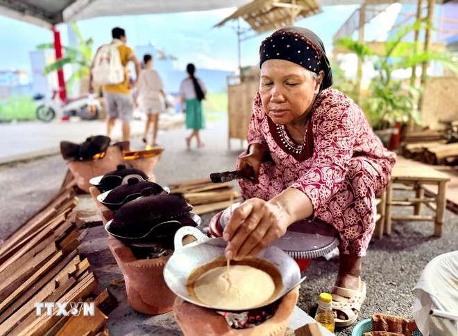 Nghệ nhân Rofiah làm bánh bò nướng Ha Cô. (Ảnh: Thanh Sang/TTXVN)