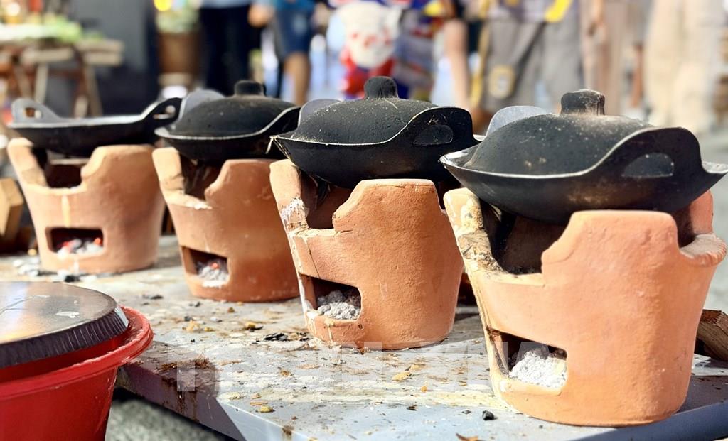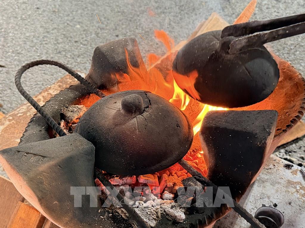 Từng chiếc chảo nhỏ nướng bánh được đặt ngay ngắn trên bếp than hồng. Ảnh: Thanh Sang - TTXVN