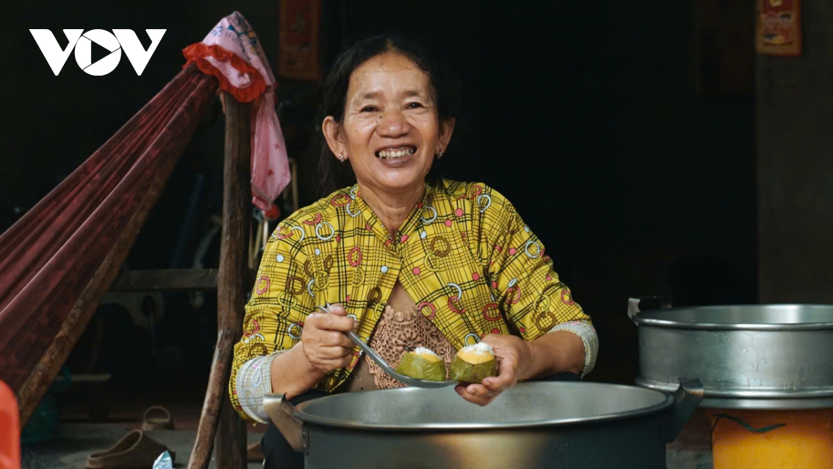 Nụ cười đôn hậu của bà Neang Khen, người đã dành hơn một thập kỷ gắn bó với bếp lửa và những chiếc bánh bò mang hương vị quê hương.