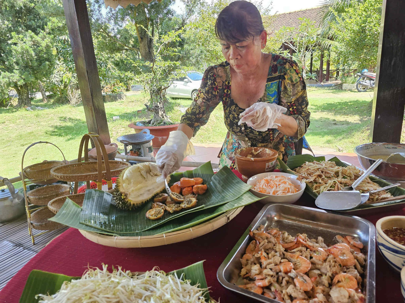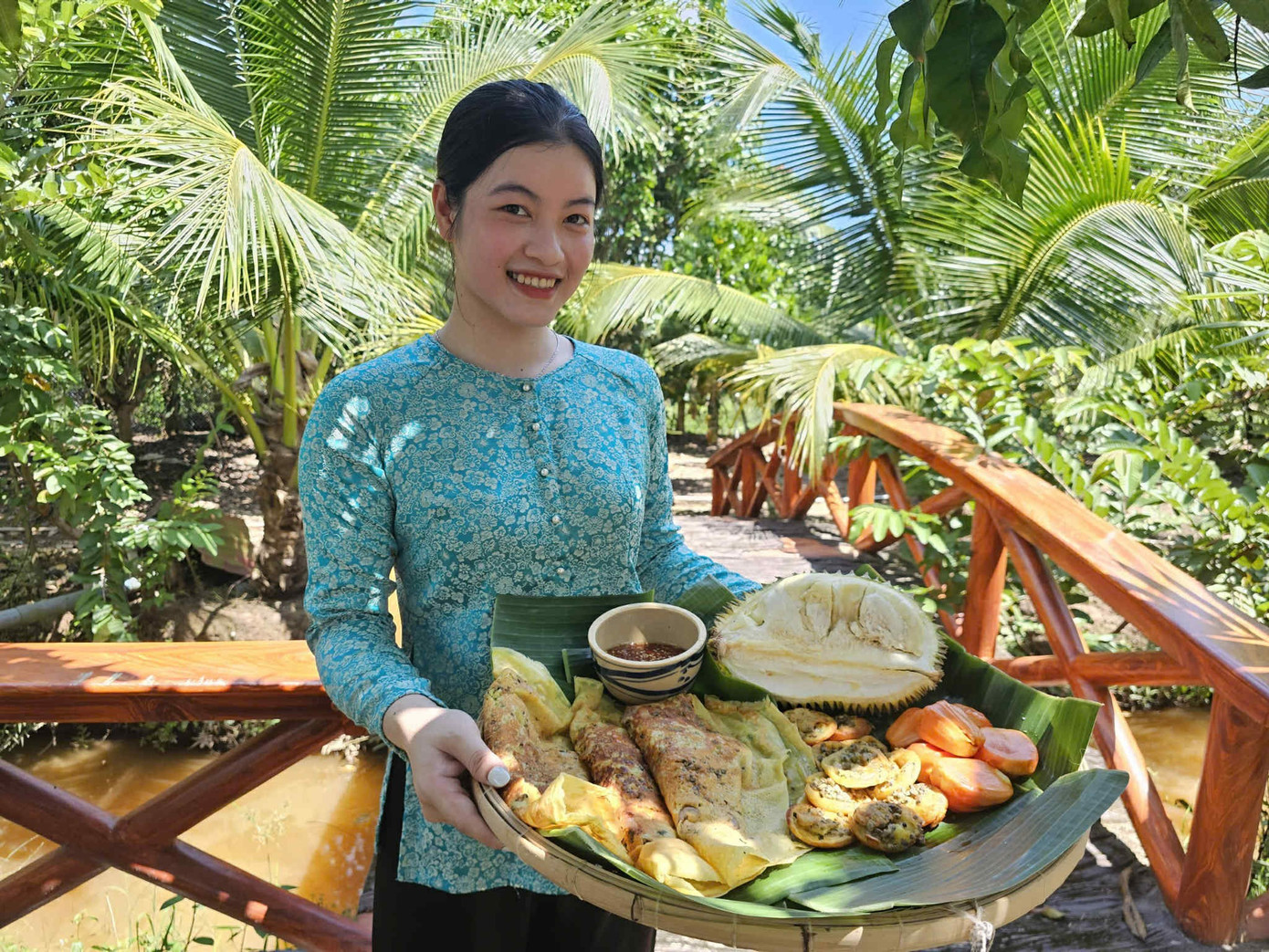 Món bánh xèo sầu riêng và bánh khọt mít của nhà vườn Long Sơn.