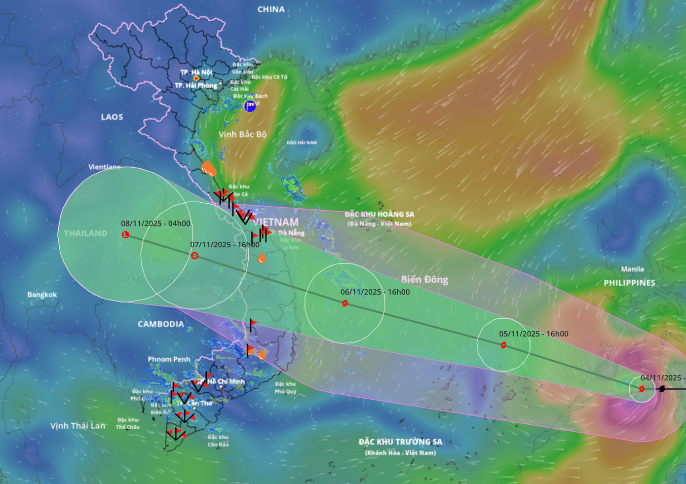 Vào 16h chiều nay (4/11), tâm bão vùng biển phía tây khu vực miền Trung Philippines, cách đảo Song Tử Tây khoảng 770km về phía đông. Sức gió mạnh nhất vùng gần tâm bão mạnh cấp 13 (134-149 km/giờ), giật cấp 16.