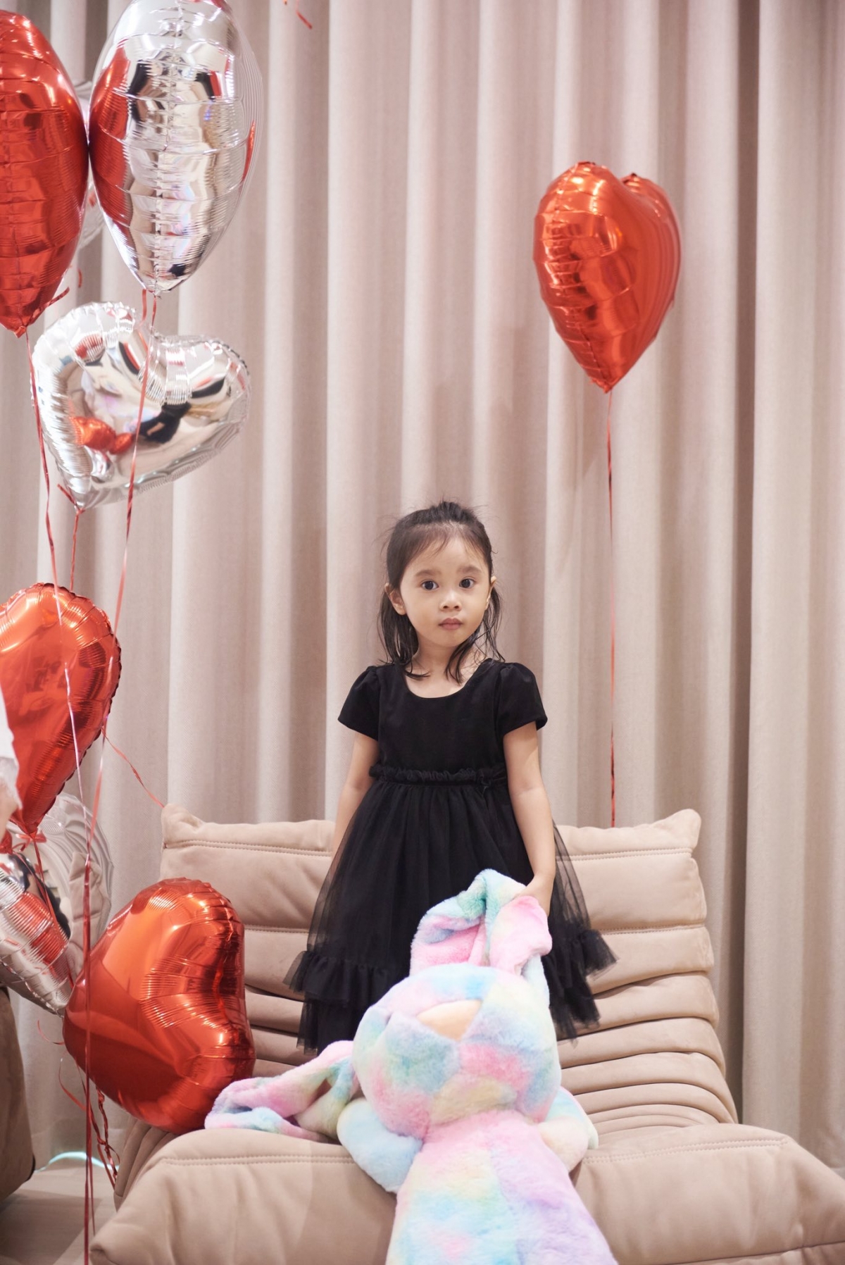 Buổi sinh nhật của bé Misumi được trang trí với bánh kem, bóng bay tông màu đỏ và trắng.
