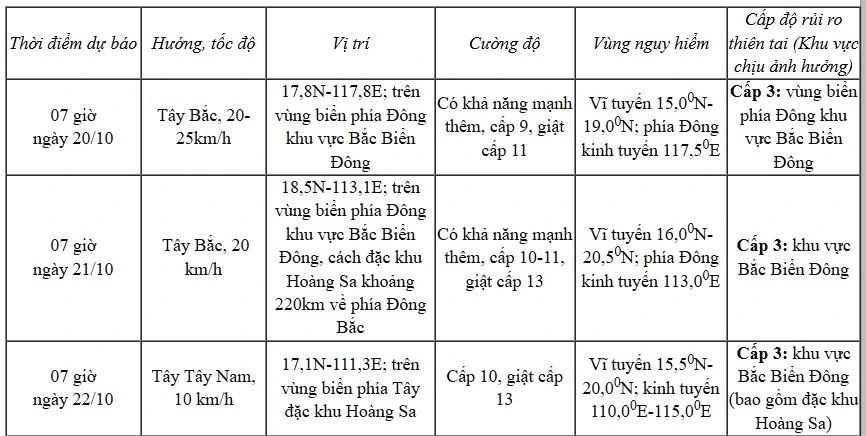 Cảnh báo, trong khoảng ngày 20 - 22/10, khu vực Bắc Biển Đông (bao gồm đặc khu Hoàng Sa) có khả năng chịu tác động của gió mạnh cấp 10 - 11, giật cấp 13.