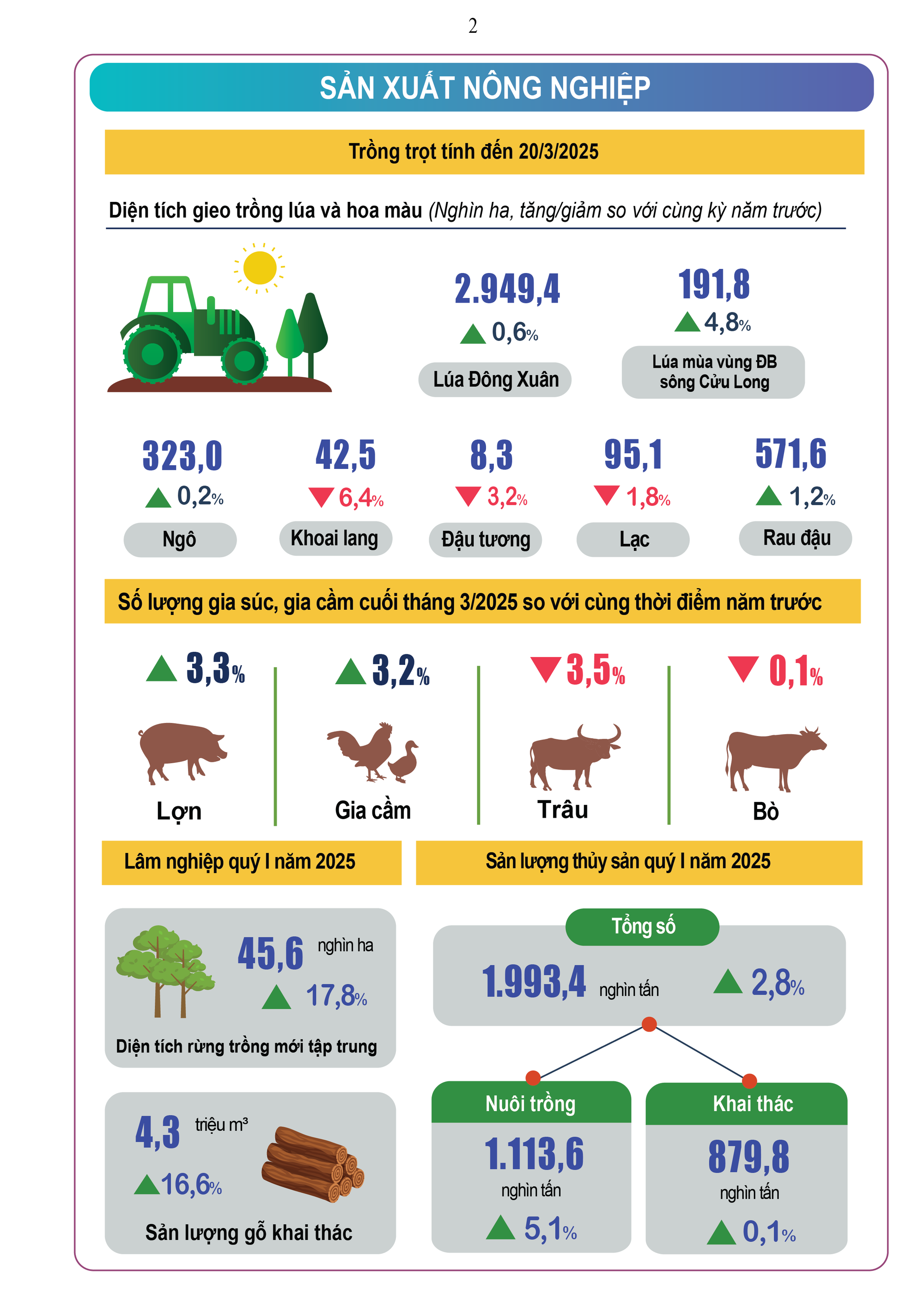 – Lúa đông xuân: Tính đến 20/3/2025, cả nước gieo cấy được 2.949,4 nghìn ha lúa đông xuân, tăng 17,2 nghìn ha so với vụ đông xuân năm 2024. Trong đó, vùng Đồng bằng sông Cửu Long gieo cấy đạt 1.508,3 nghìn ha, tăng 20,7 nghìn ha; diện tích thu hoạch đạt 1.060,3 nghìn ha, chiếm 70,3% diện tích gieo cấy và bằng 105,3% cùng kỳ năm trước; năng suất ước đạt 72,0 tạ/ha, giảm 0,3 tạ/ha so với vụ đông xuân năm trước; sản lượng ước đạt 10,9 triệu tấn, tăng 109 nghìn tấn.