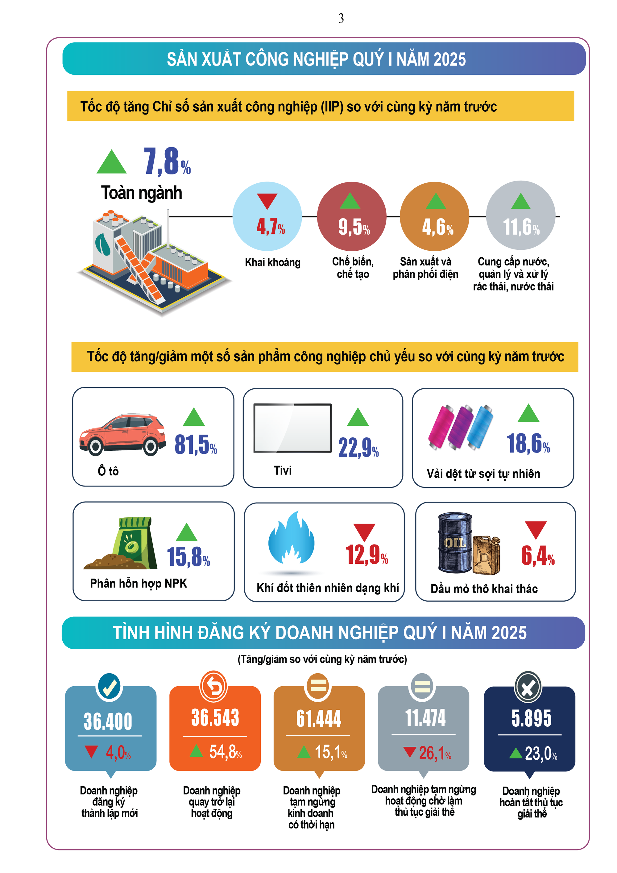 – Chỉ số sản xuất công nghiệp quý I/2025 so với cùng kỳ năm trước tăng ở 59 địa phương và giảm ở 04 địa phương trên cả nước.