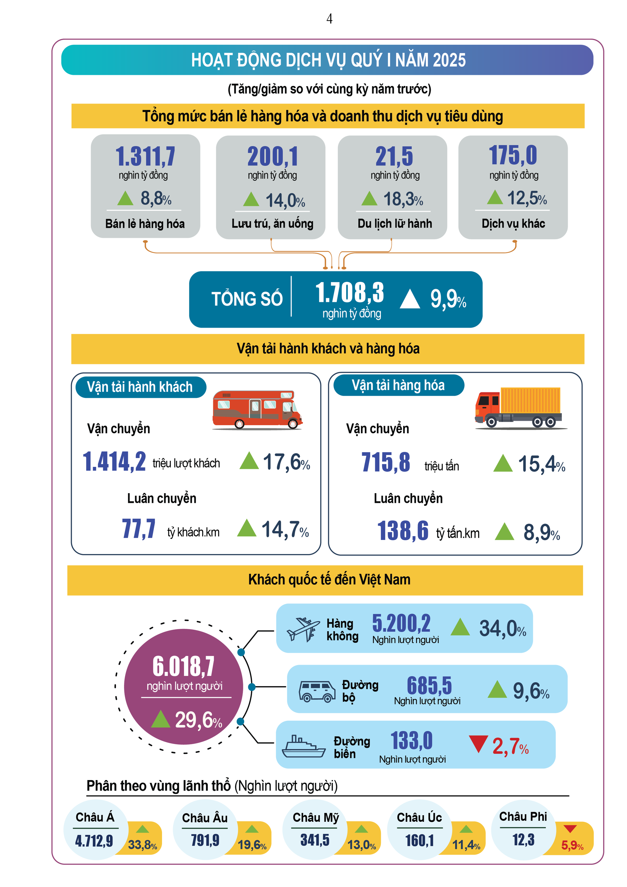 Trong khu vực dịch vụ, nhu cầu tiêu dùng vào dịp Tết Nguyên đán và số lượng khách quốc tế đến Việt Nam tăng cao góp phần cho tăng trưởng của ngành thương mại và dịch vụ đạt mức tăng khá cao. Đóng góp của một số ngành dịch vụ vào mức tăng tổng giá trị tăng thêm của toàn nền kinh tế quý I năm nay như sau: Ngành vận tải kho bãi tăng 9,90% so với cùng kỳ năm trước, đóng góp 0,67 điểm phần trăm; dịch vụ lưu trú và ăn uống tăng 9,31%, đóng góp 0,27 điểm phần trăm; ngành bán buôn và bán lẻ tăng 7,47%, đóng góp 0,83 điểm phần trăm; hoạt động tài chính, ngân hàng và bảo hiểm tăng 6,83%, đóng góp 0,41 điểm phần trăm; ngành thông tin và truyền thông tăng 6,66%, đóng góp 0,45 điểm phần trăm.