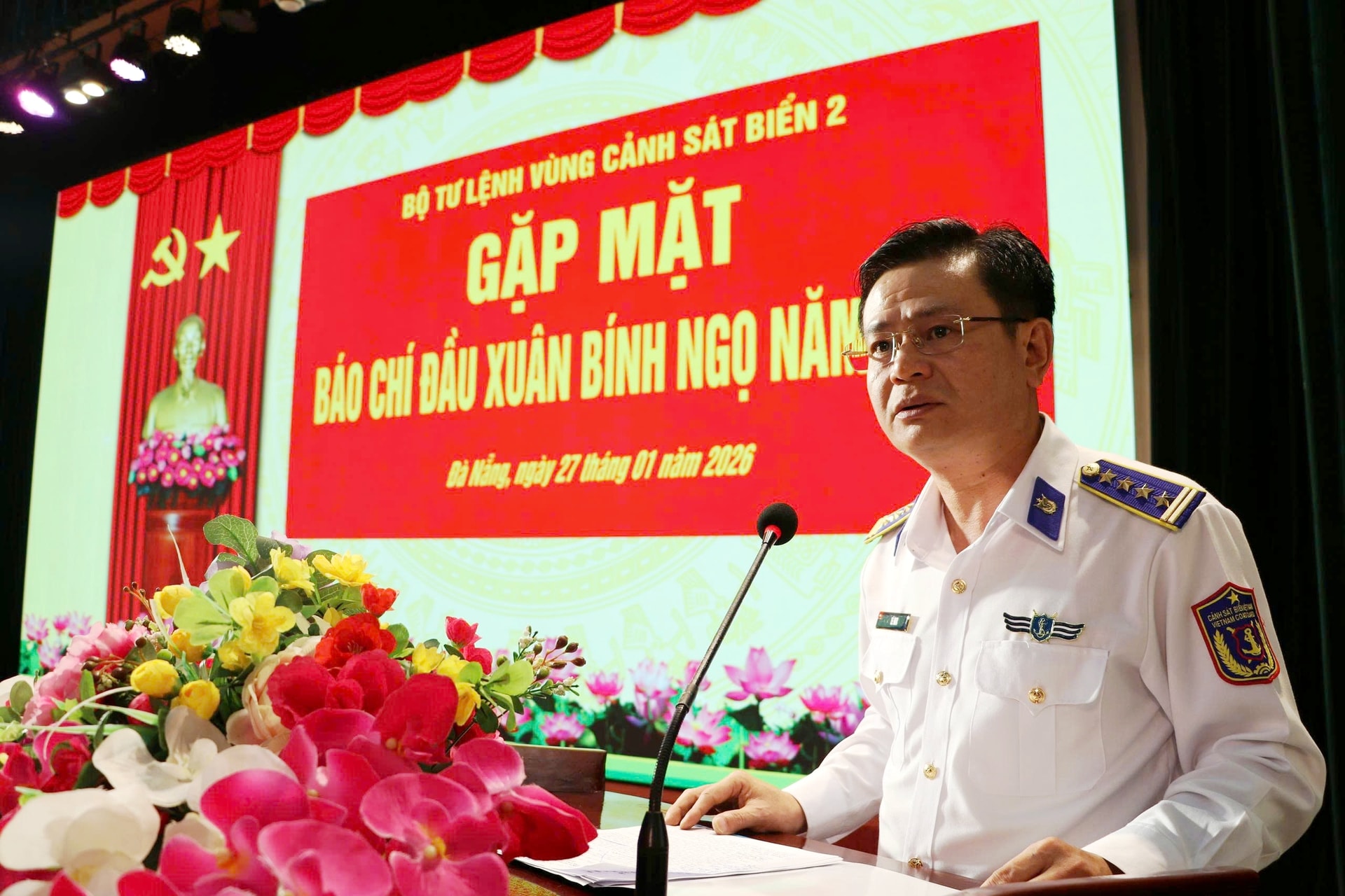 Đại tá Lê Huy - Chính ủy BTL Vùng Cảnh sát biển 2 phát biểu tại buổi gặp mặt.