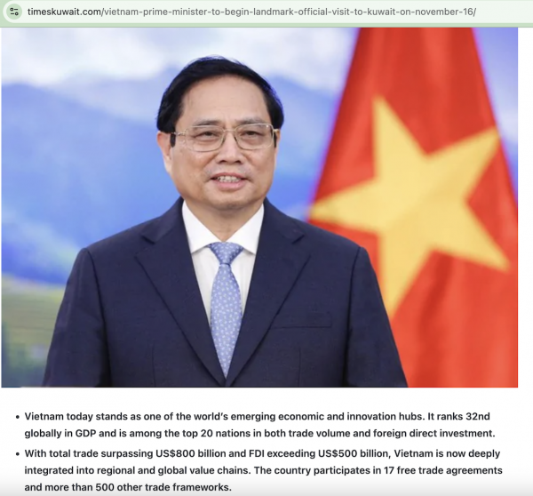 "Về đối ngoại, Việt Nam duy trì quan hệ với 194 quốc gia, trong đó có 38 đối tác toàn diện hoặc chiến lược, đồng thời tham gia hơn 70 tổ chức quốc tế, thể hiện vai trò ngày càng quan trọng trong hợp tác đa phương và gìn giữ hòa bình. Chuyến thăm của Thủ tướng được kỳ vọng tạo xung lực mới cho quan hệ Việt Nam – Kuwait, củng cố tình hữu nghị lâu đời và mở ra chương hợp tác mới cho giai đoạn 50 năm tiếp theo", bài viết có đoạn.