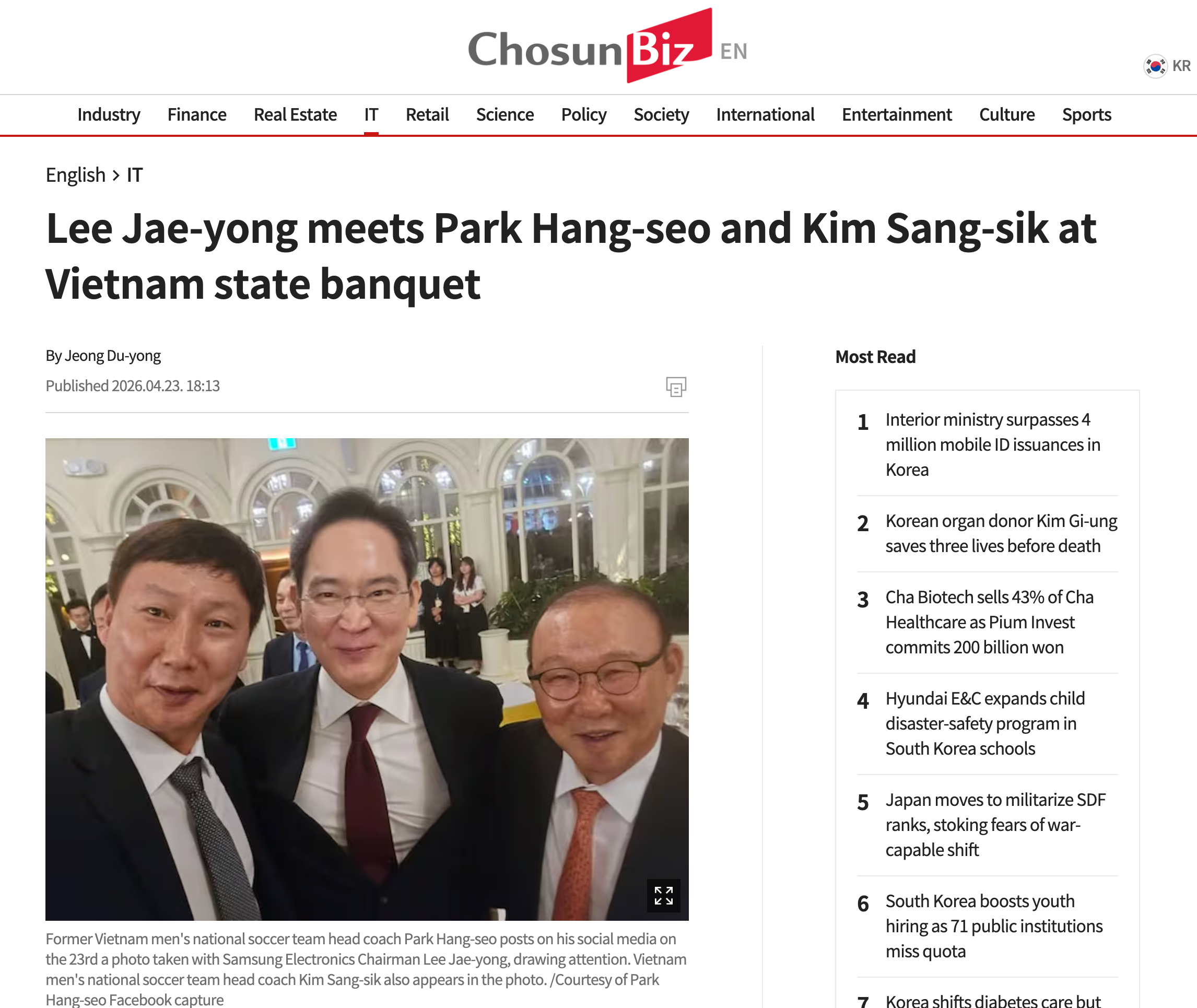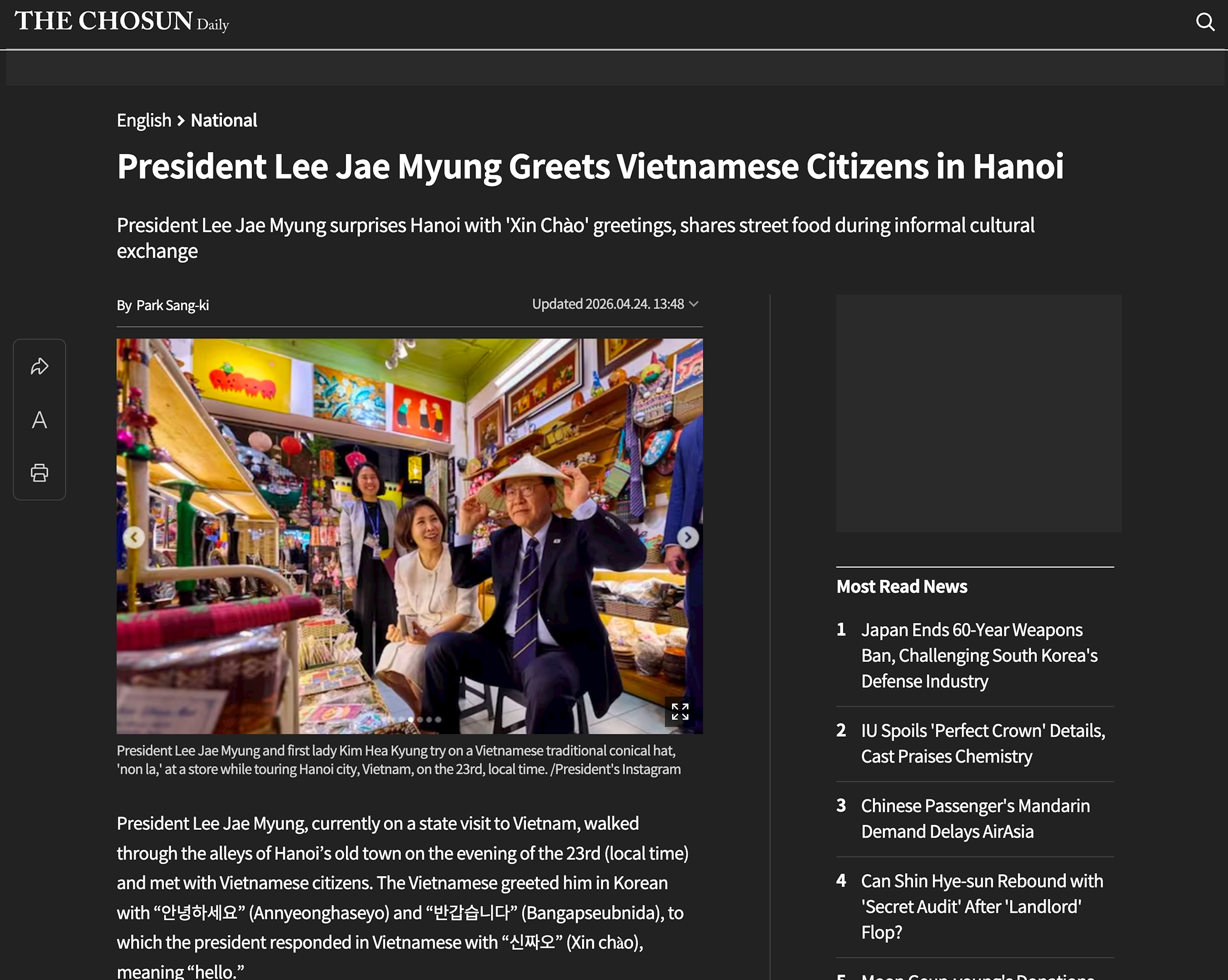 Trong khi đó, Chosun Daily ấn tượng trước việc người dân Việt Nam vui vẻ chào đón nhà lãnh đạo Hàn Quốc bằng tiếng Hàn với "안녕하세요" (Annyeonghaseyo) và "반갑습니다" (Bangapseubnida), sau đó, Tổng thống Lee Jae Myung đã đáp lại bằng tiếng Việt "Xin chào".
