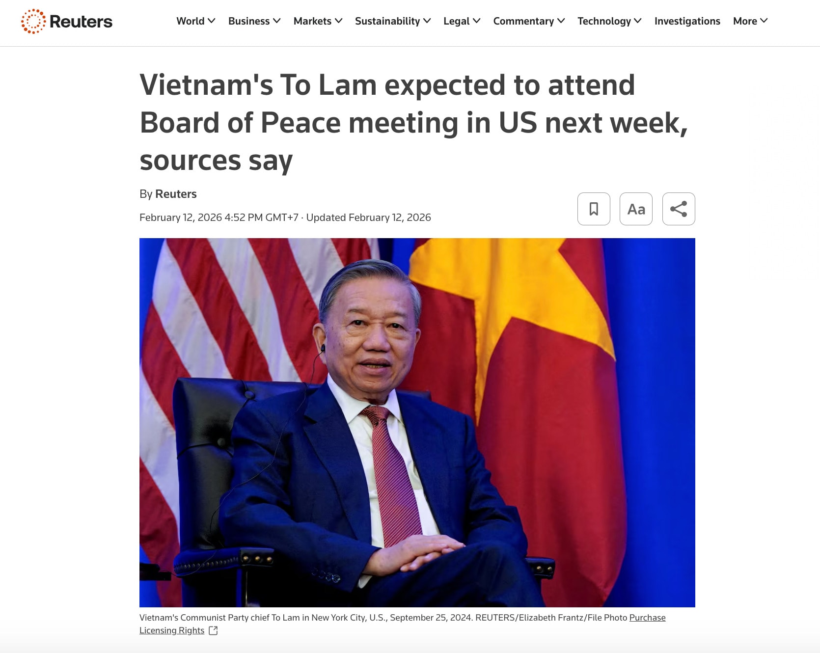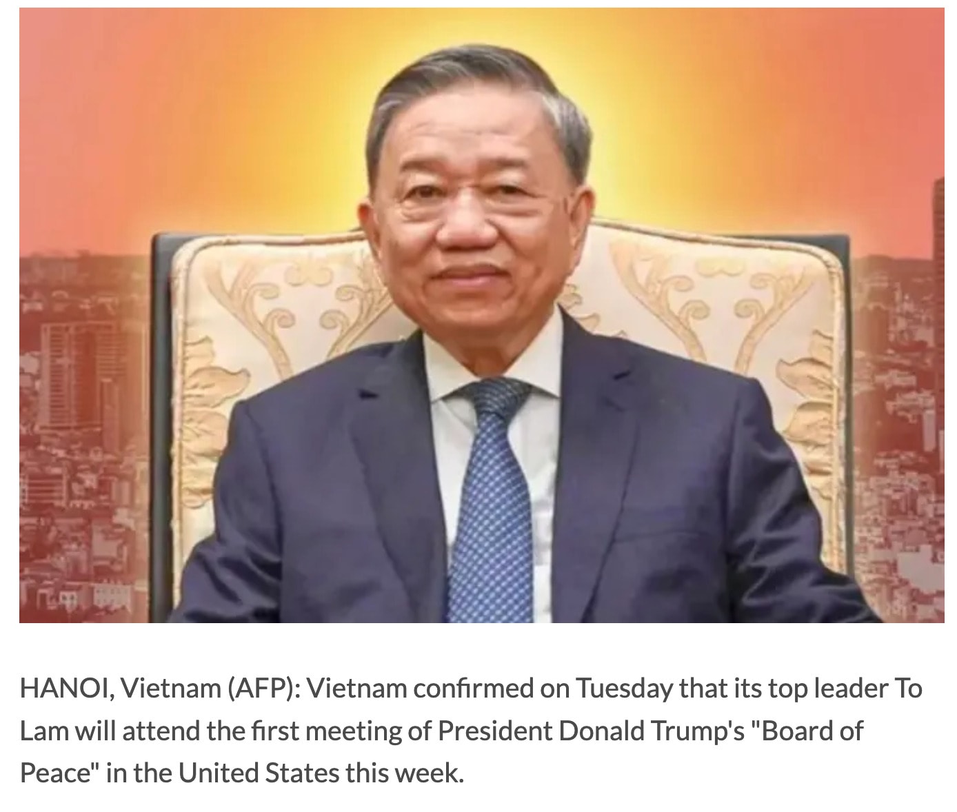 Nhiều hãng thông tấn và cơ quan báo chí quốc tế hôm nay đồng loạt đưa tin về chuyến công tác tới Mỹ của Tổng Bí thư Ban Chấp hành Trung ương Đảng Cộng sản Việt Nam Tô Lâm để tham dự phiên họp đầu tiên của Hội đồng Hòa bình Gaza - sáng kiến do Tổng thống Mỹ Donald Trump đề xuất nhằm xử lý các xung đột quốc tế, trong đó có tình hình Gaza. Hãng tin Reuters, AFP, Channel News Asia đăng tải các bài viết cho biết Tổng Bí thư Tô Lâm đã lên đường tới Mỹ theo lời mời của Tổng thống Donald Trump.