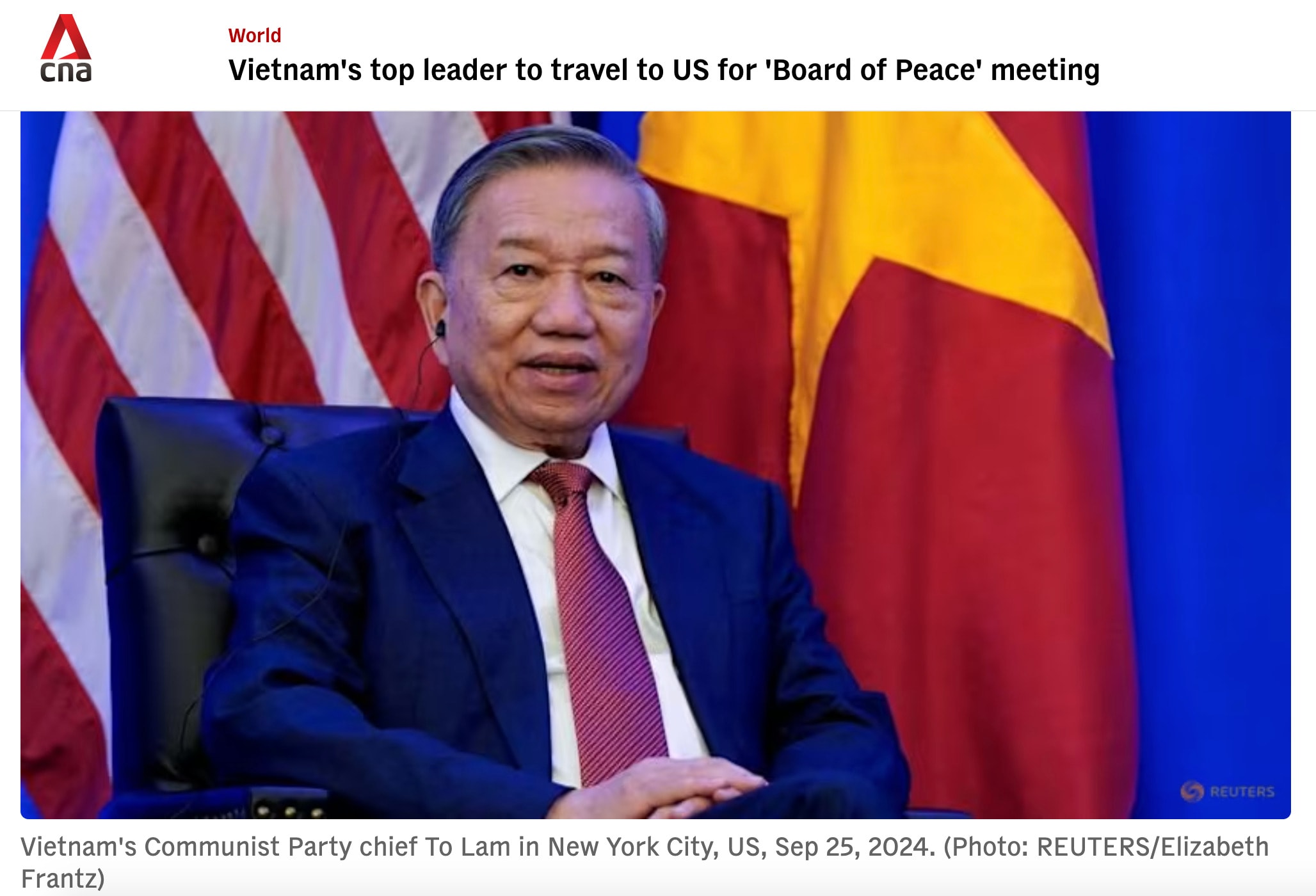 Báo Channel News Asia nhận định, chuyến đi của nhà lãnh đạo Việt Nam diễn ra trong bối cảnh quan hệ Việt Nam và Mỹ đang phát triển mạnh sau khi nâng cấp lên Đối tác Chiến lược Toàn diện. Bên cạnh việc tham gia các hoạt động của Hội đồng Hòa bình Gaza, chuyến đi có thể bao gồm các trao đổi song phương bên lề hội nghị.