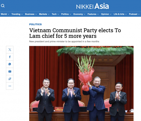Bài viết đăng tải trên Báo Nikkei của Nhật Bản với tiêu đề "Tổng Bí thư Tô Lâm tiếp tục giữ chức Tổng Bí thư Ban Chấp hành Trung ương Đảng Việt Nam khóa XIV" nêu rõ, kể từ khi Tổng Bí thư Tô Lâm được bầu giữ chức vụ này từ năm 2024, Việt Nam đã thực hiện những cải cách quan trọng nhất trong 4 thập niên và công bố các mục tiêu tăng trưởng kinh tế đầy tham vọng.